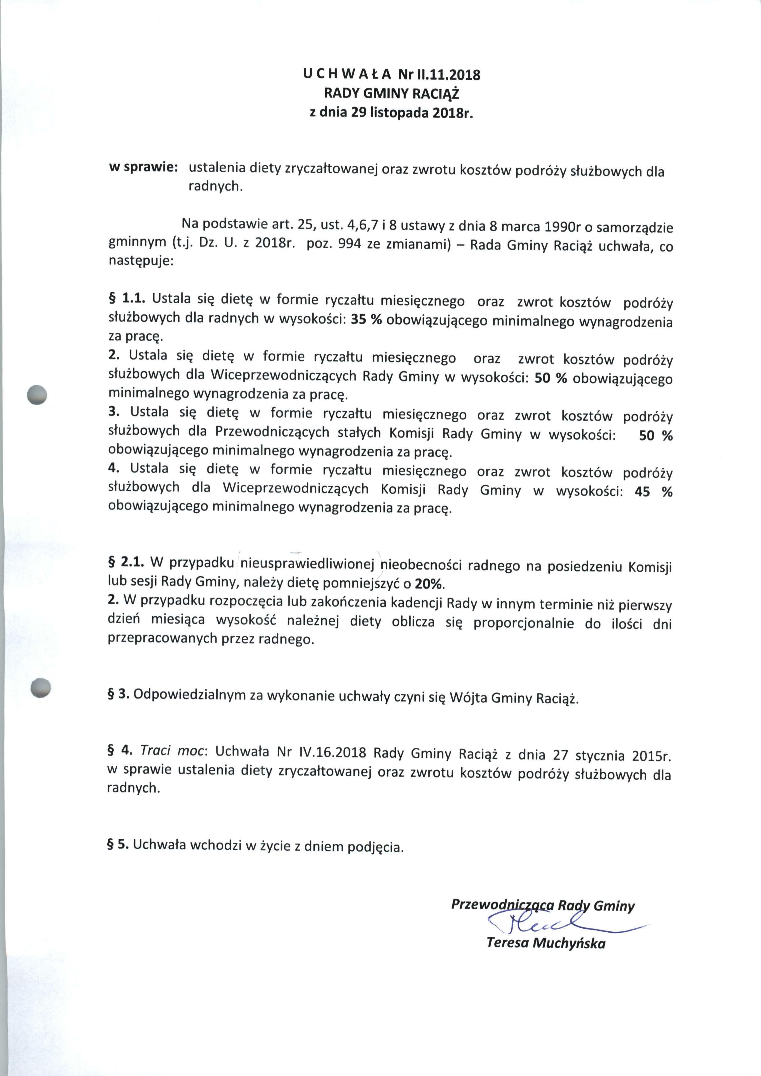 Uchwała Nr.II.11.2018 RADY GMINY RACIĄŻ z dnia 29 listopada 2018 roku
