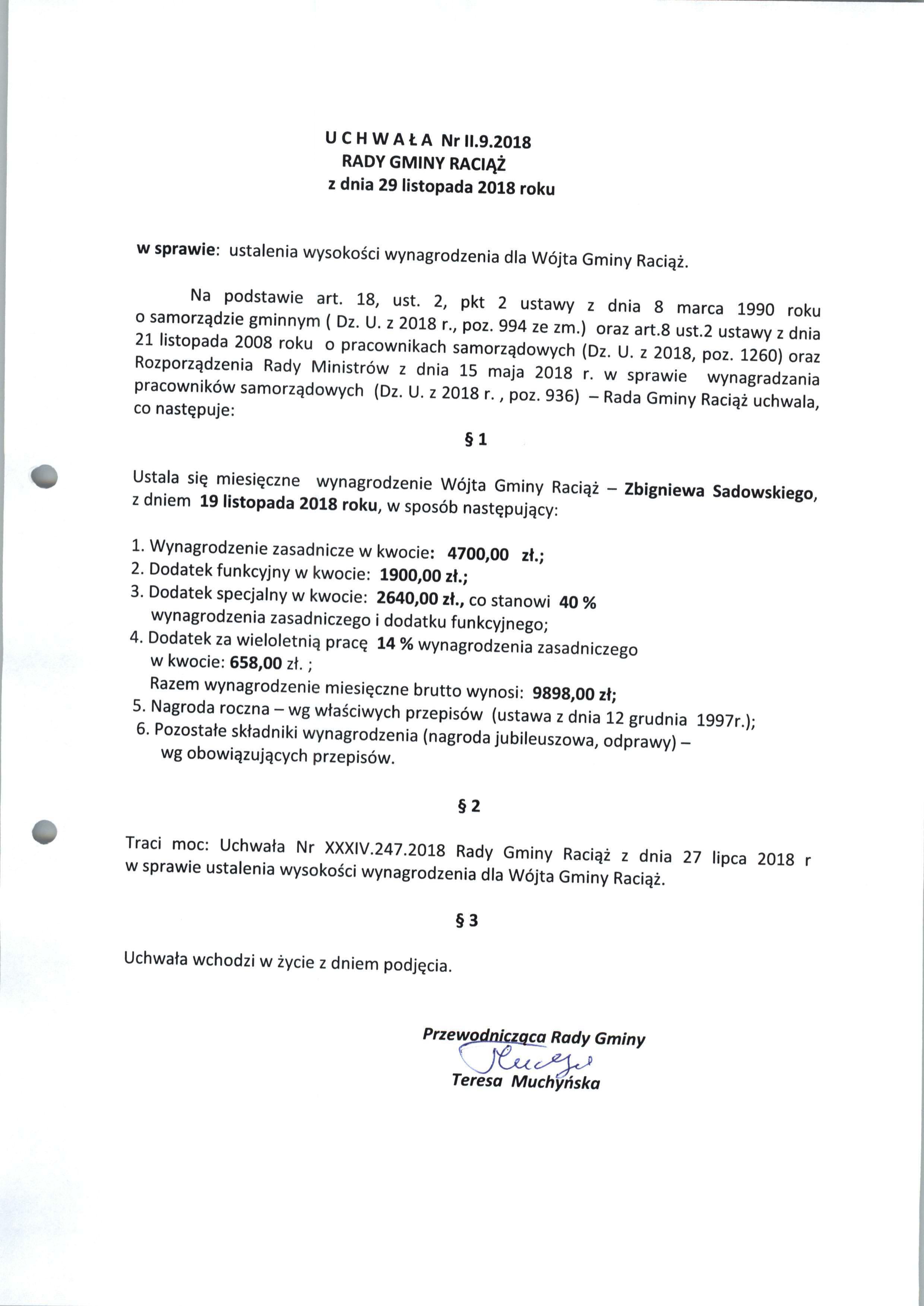 Uchwała Nr.II.9.2018 RADY GMINY RACIĄŻ z dnia 29 listopada 2018 roku
