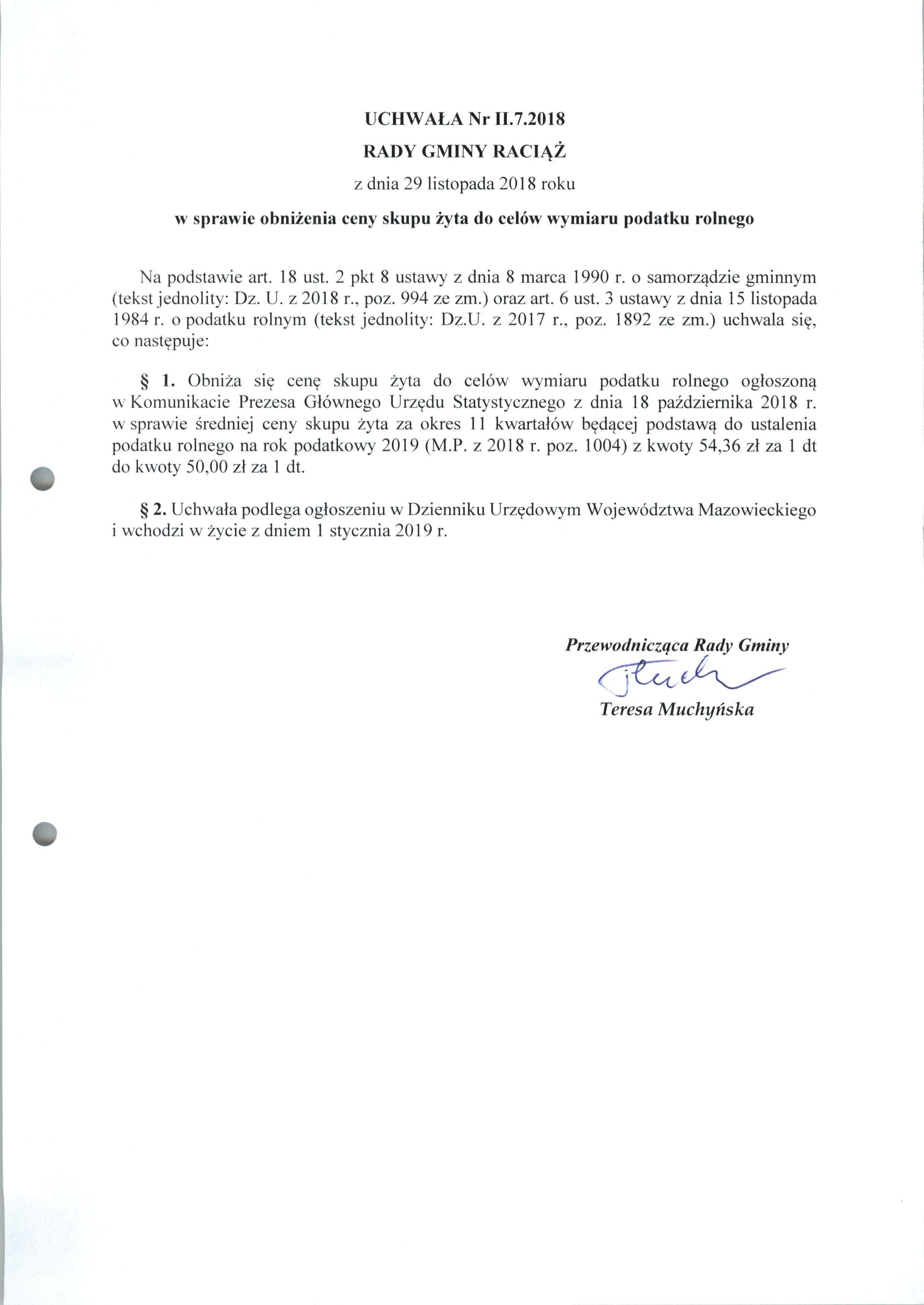 Uchwała Nr.II.7.2018 RADY GMINY RACIĄŻ z dnia 29 listopada 2018 roku