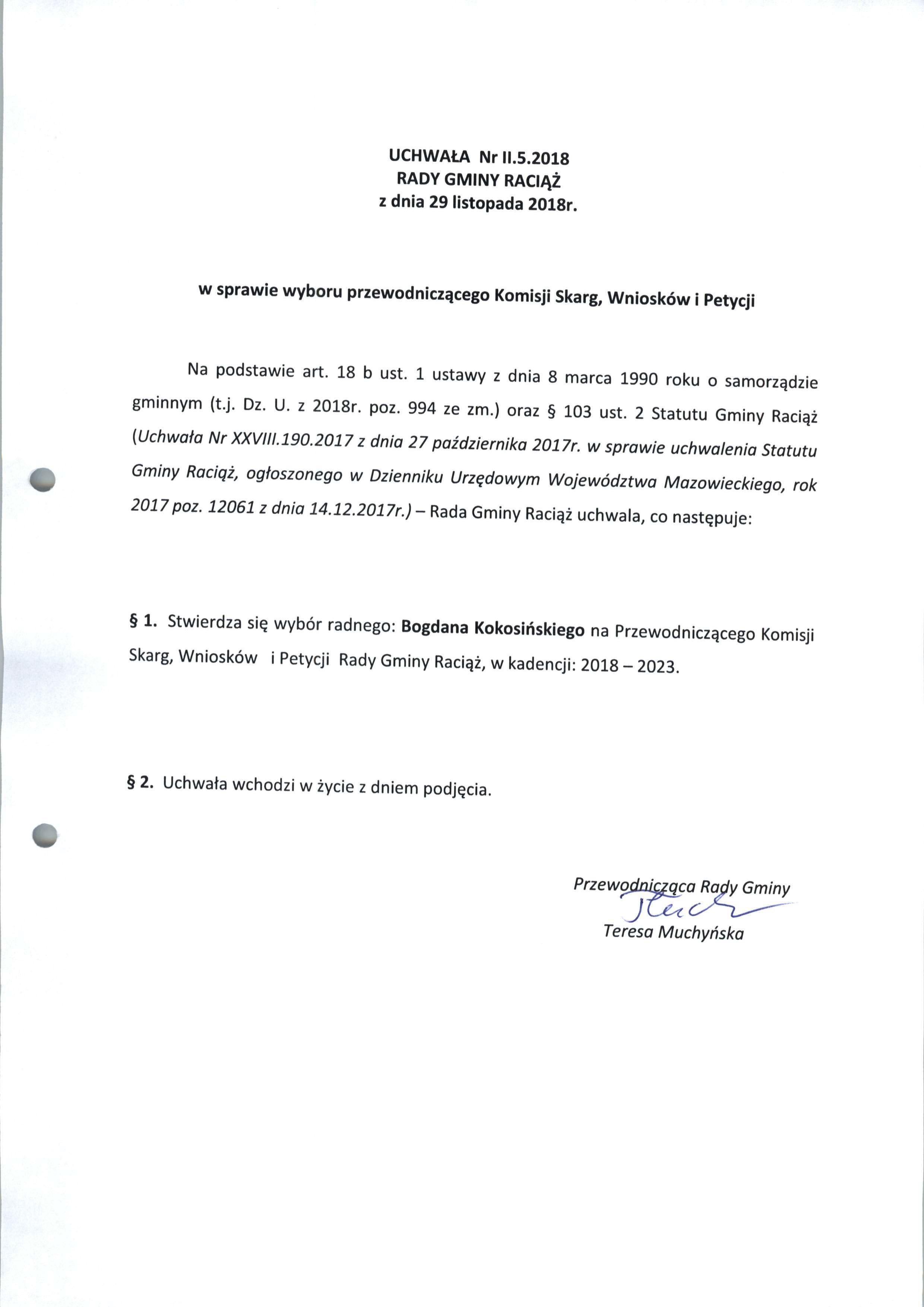 Uchwała Nr.II.5.2018 RADY GMINY RACIĄŻ z dnia 29 listopada 2018 roku