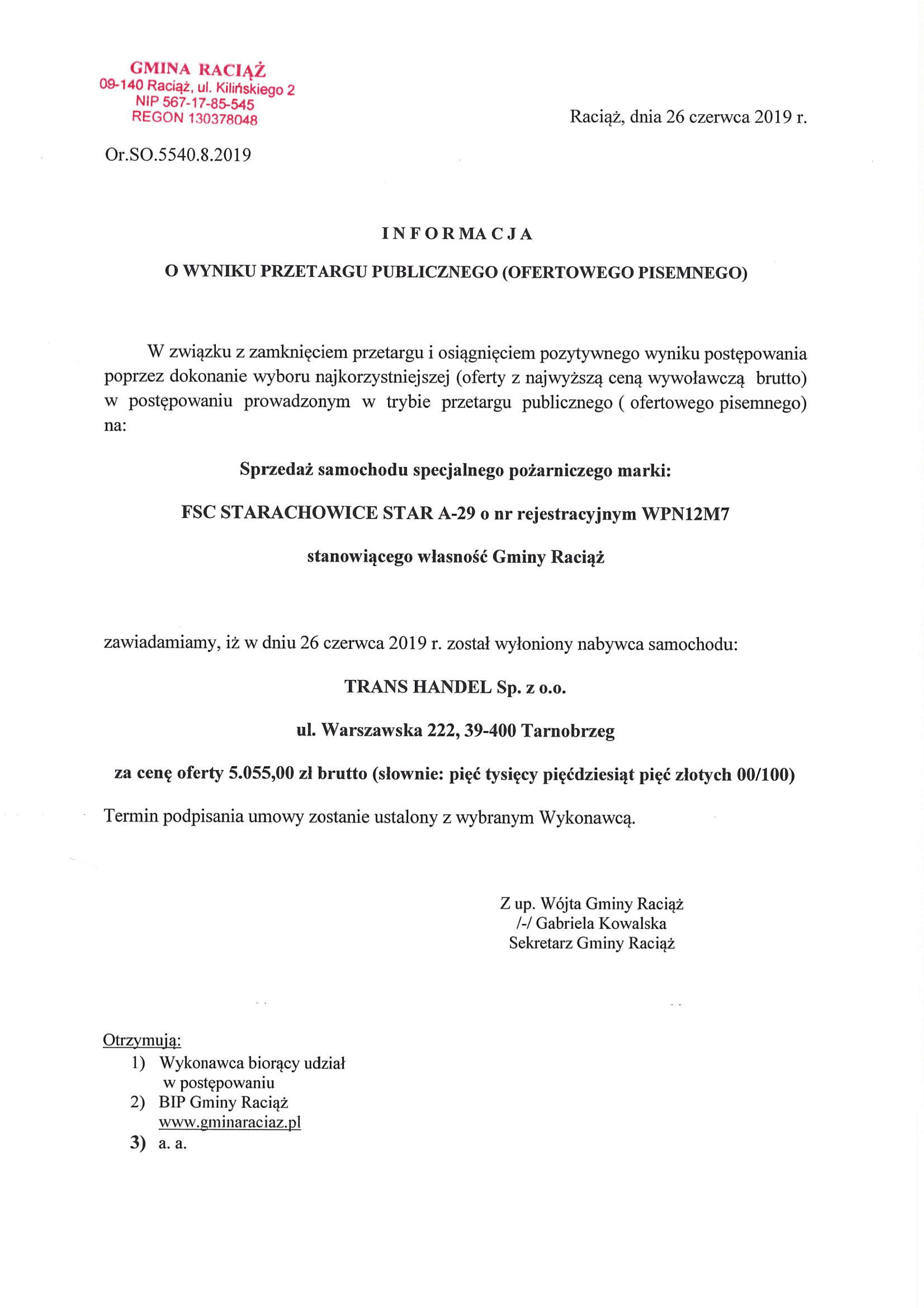 Informacja o wyniku przetargu publicznego (ofertowego pisemnego)
