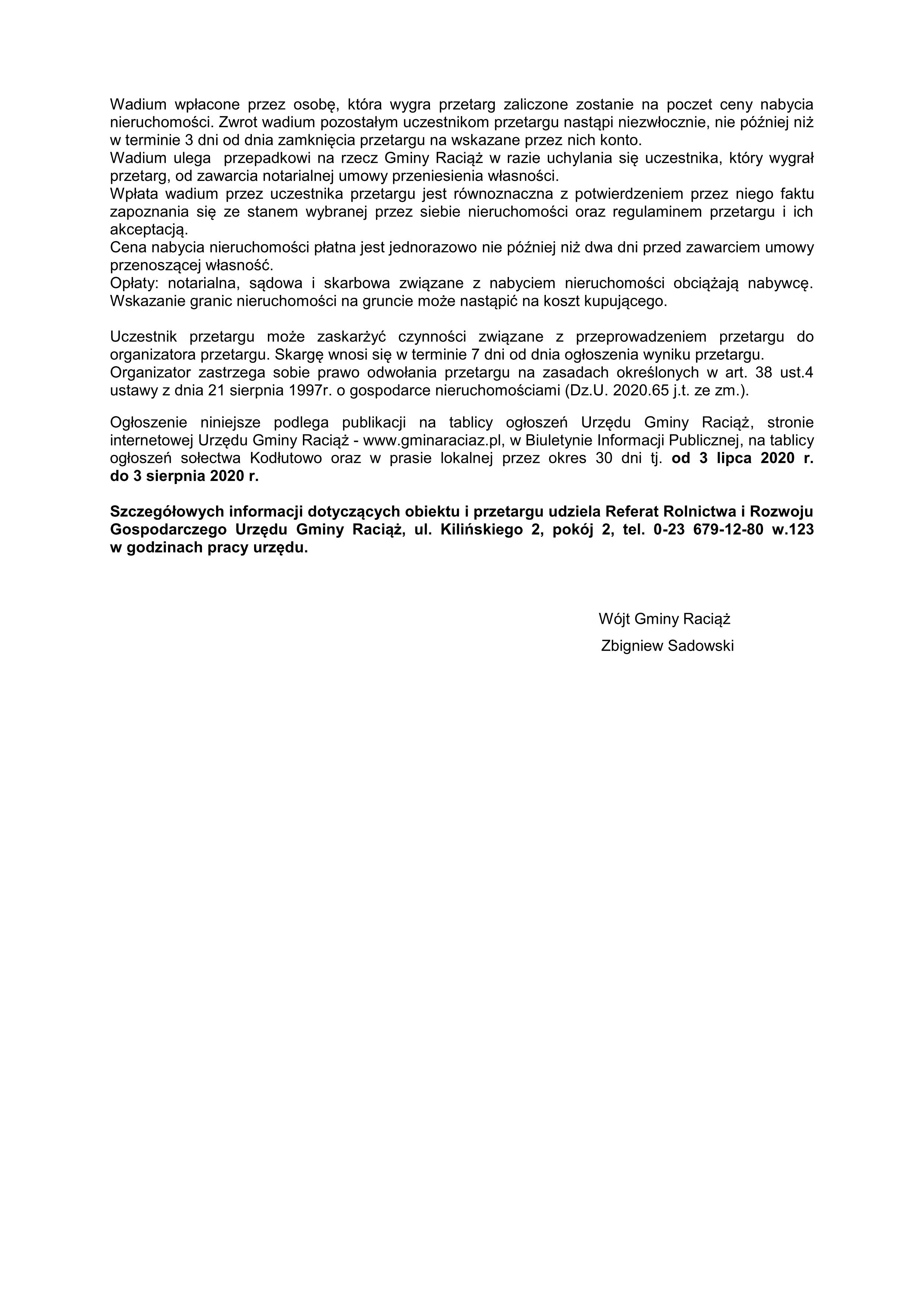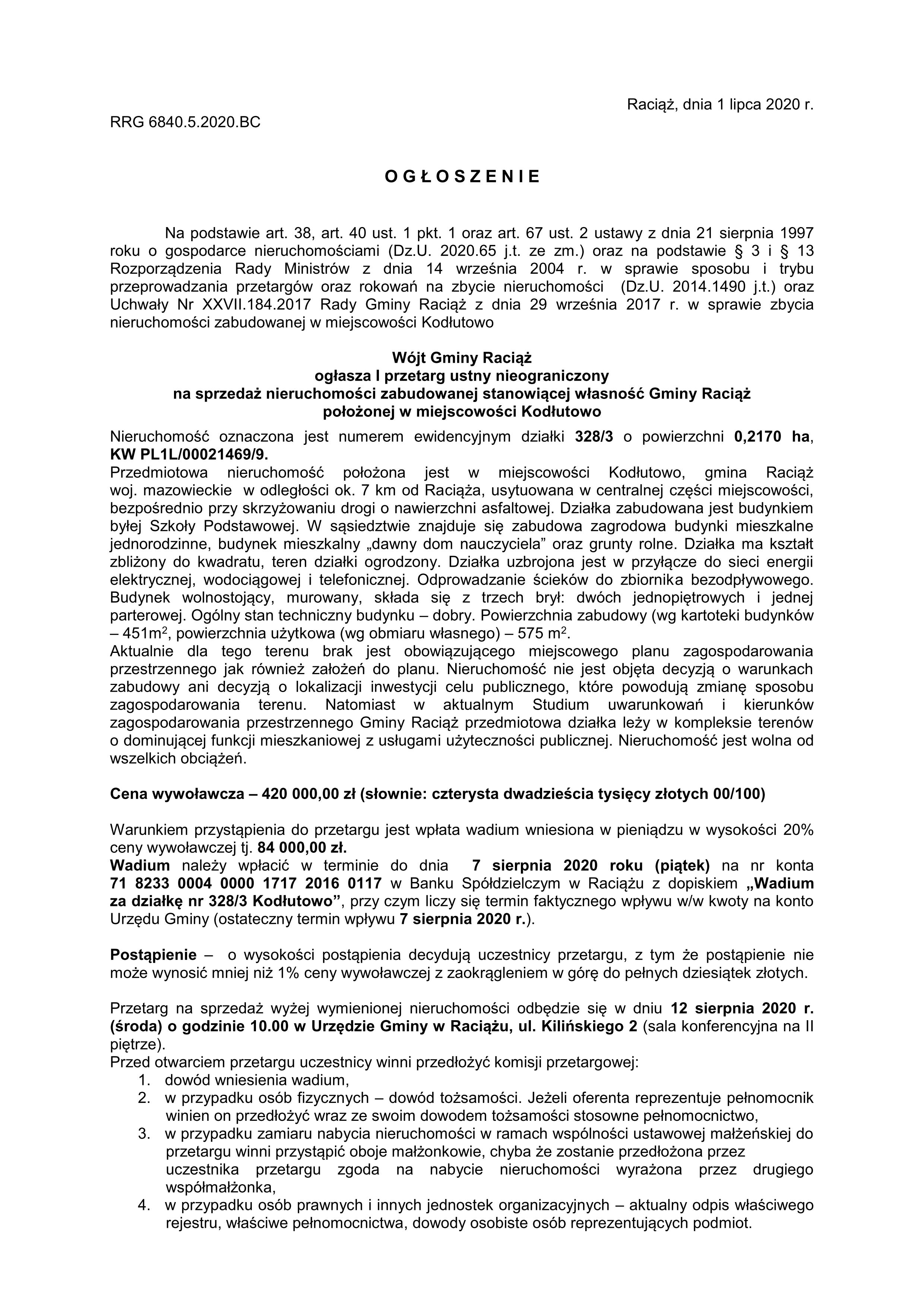 Wójt Gminy Raciąż ogłasza I przetarg ustny nieograniczony na sprzedaż nieruchomości zabudowanej stanowiącej własność Gminy Raciąż położonej w miejscowości Kodłutowo