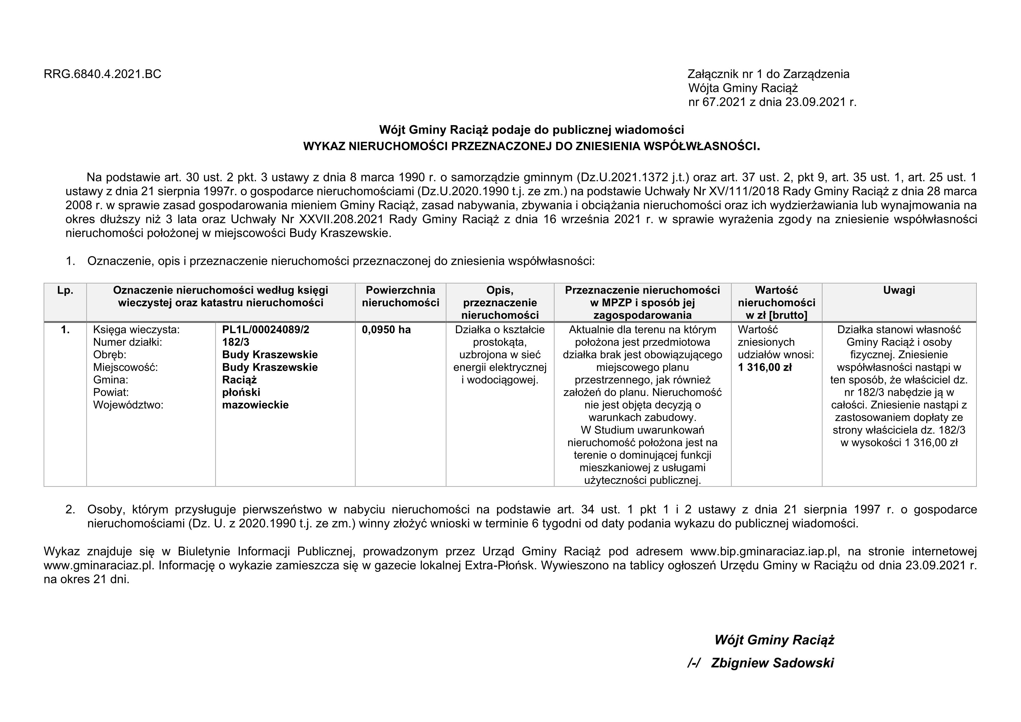 Wójt Gminy Raciąż podaje do publicznej wiadomości wykaz nieruchomości przeznaczonej do zniesienia współwłasności.