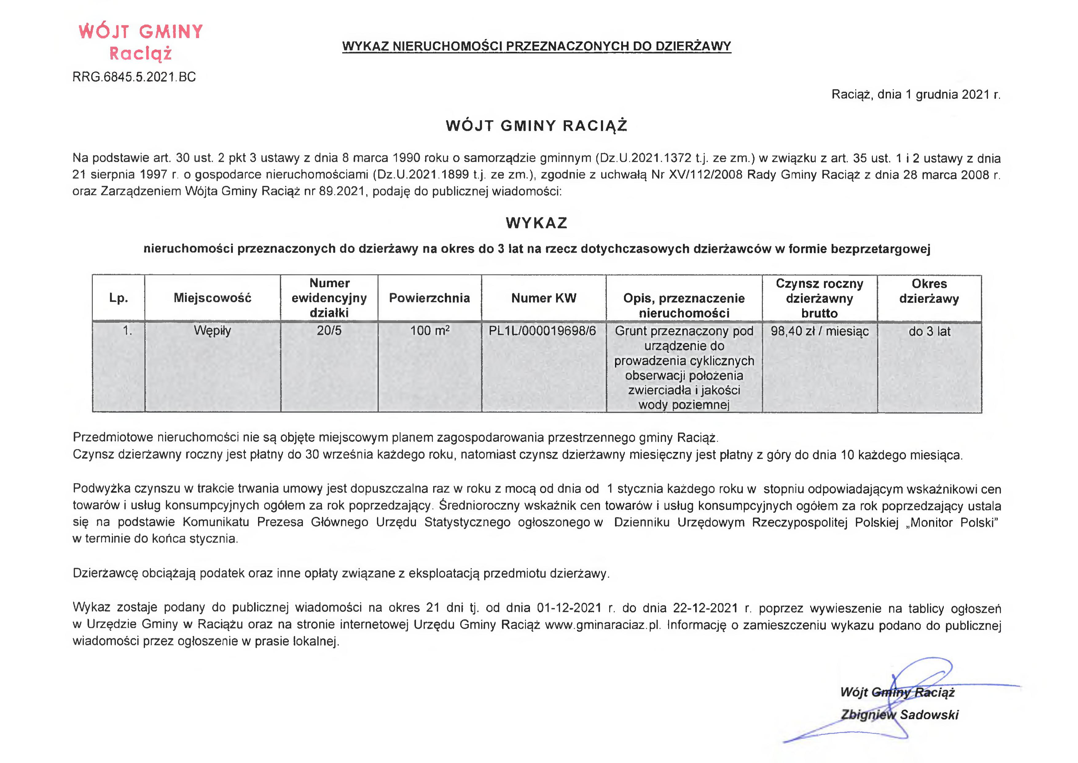 WYKAZ NIERUCHOMOŚCI PRZEZNACZONYCH DO DZIERŻAWY