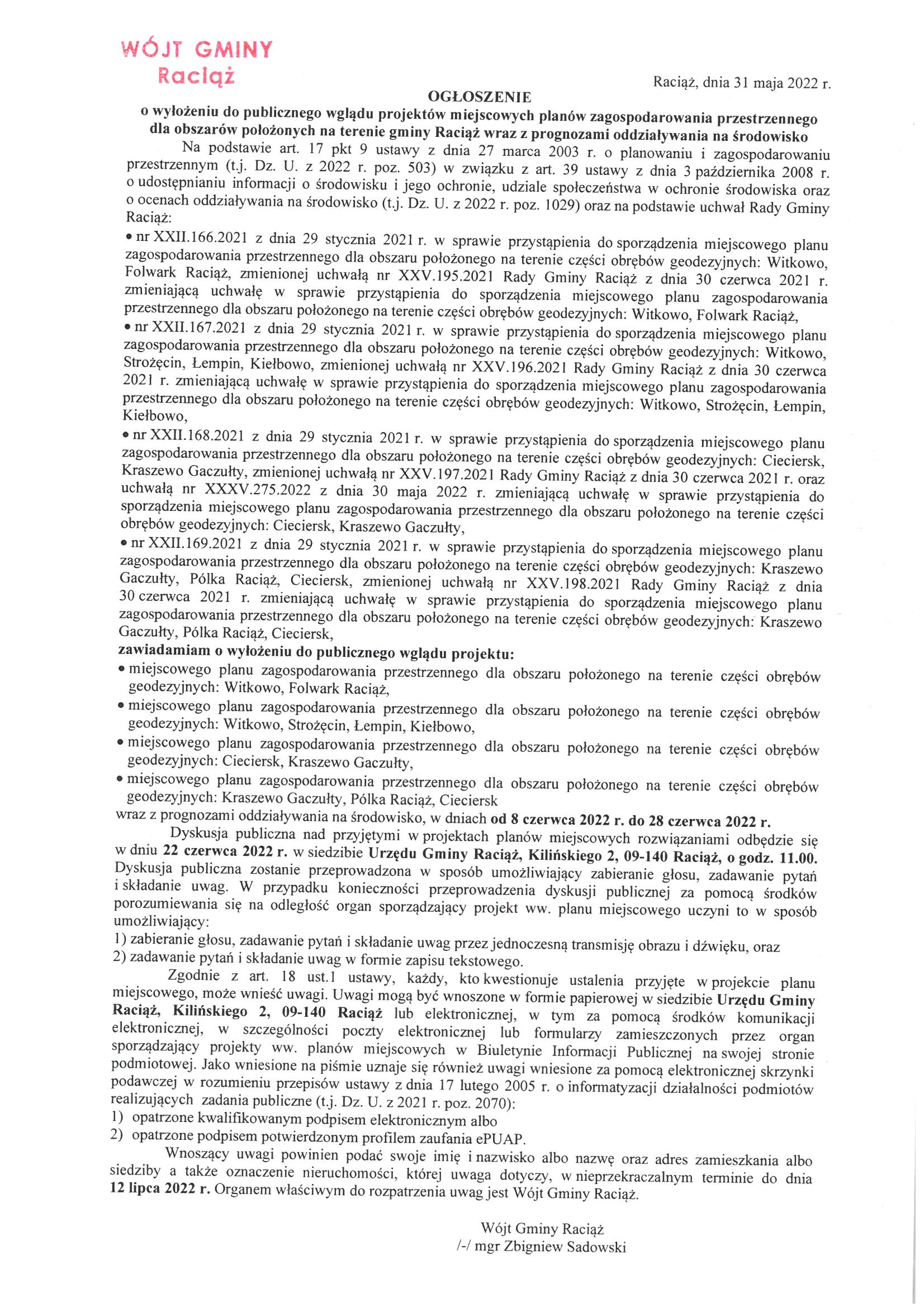 OGŁOSZENIE o wyłożeniu do publicznego wglądu projektów miejscowych planów zagospodarowania przestrzennego dla obszarów położonych na terenie gminy Raciąż wraz z prognozami oddziaływania na środowisko.