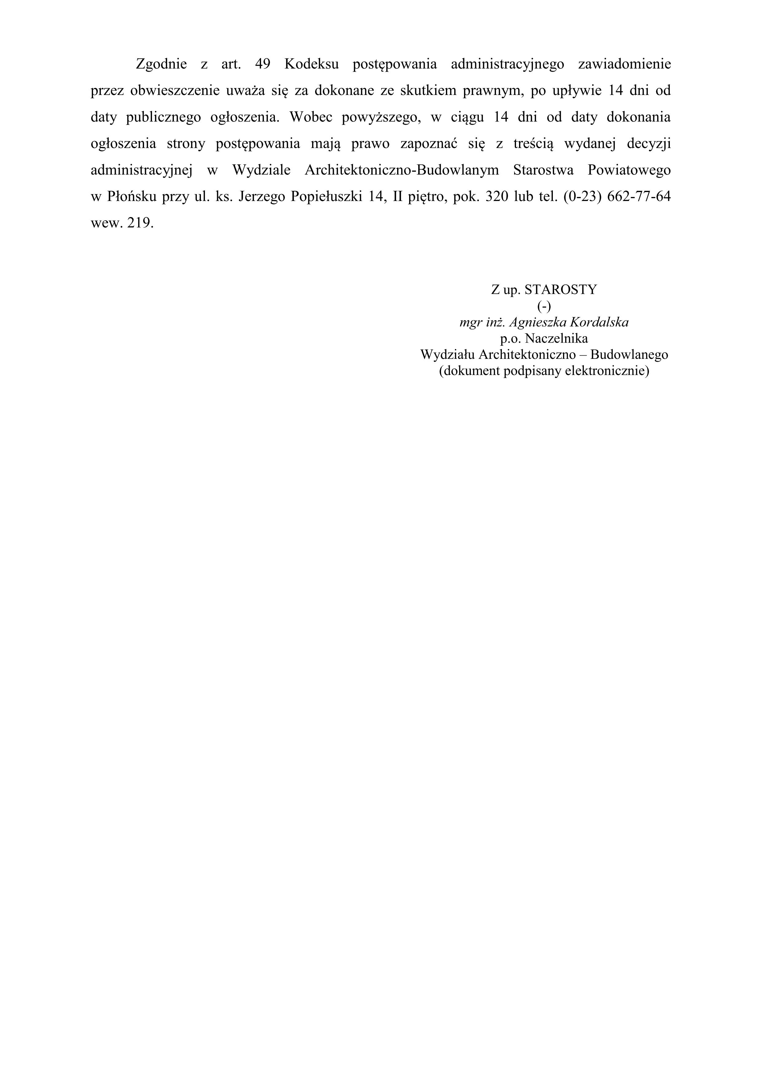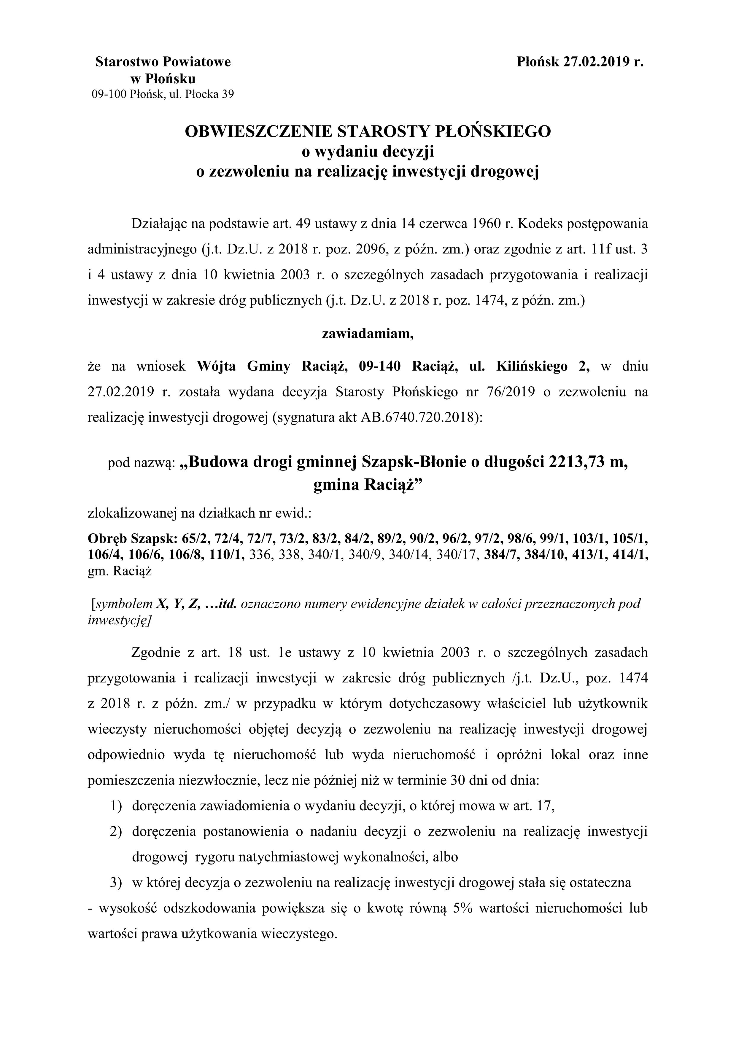Obwieszczenie Staroty Płońskiego - Budowa drogi gminnej Szapsk-Błonie