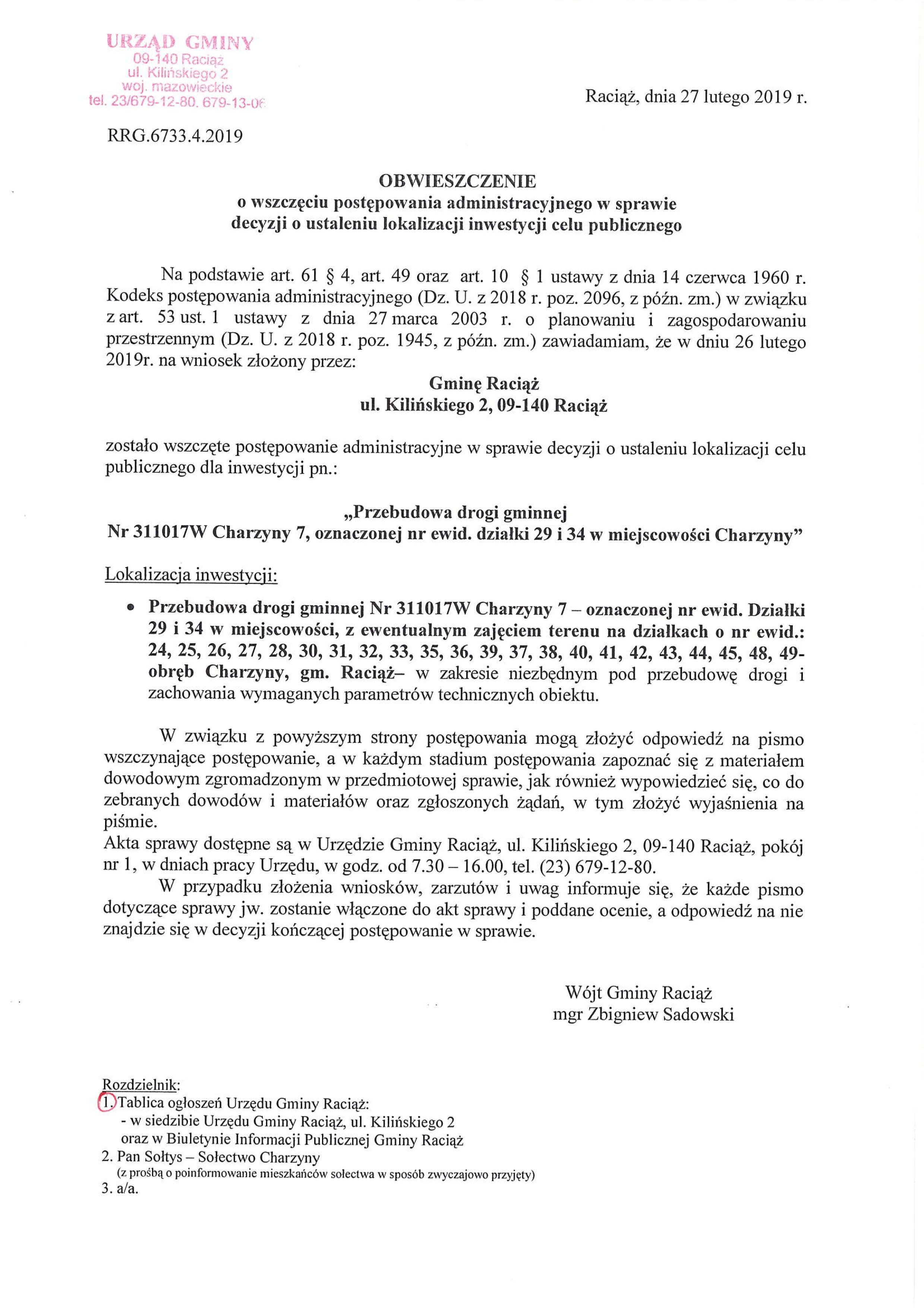 Obwieszczenie – przebudowa drogi Charzyny działki nr 29 i 34