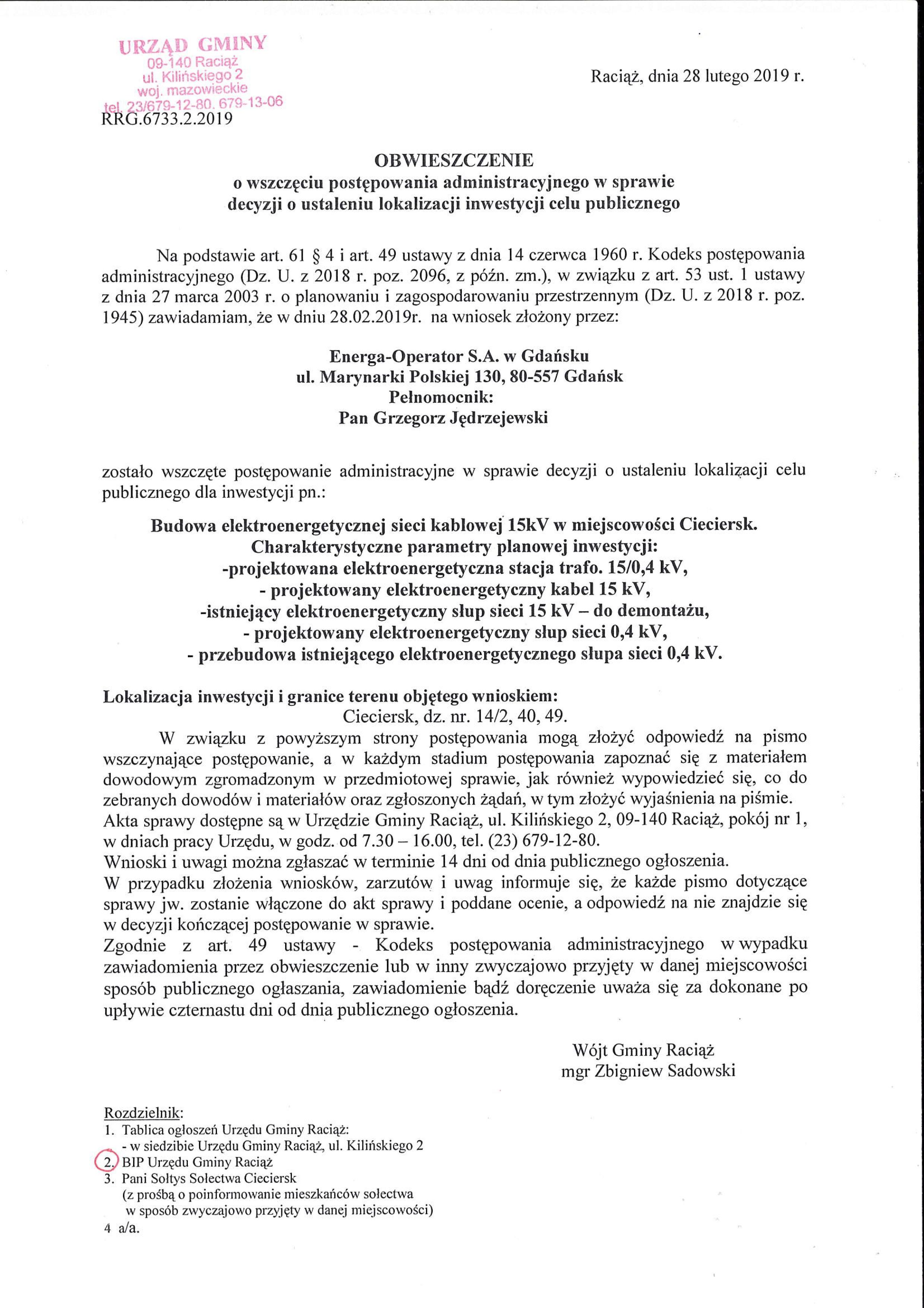 Obwieszczenie – sieć elektroenergetyczna CIECIERSK