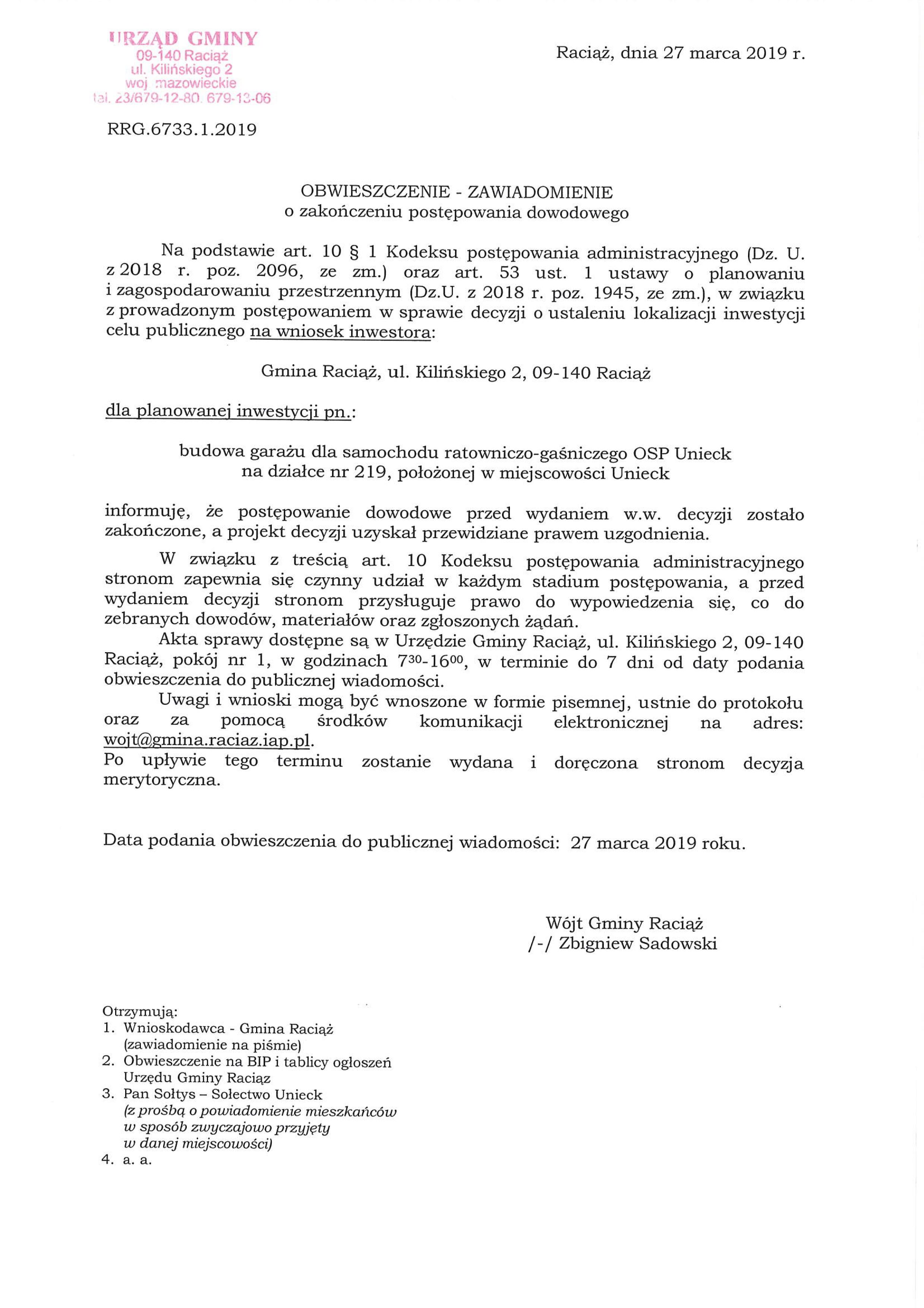 Obwieszczenie – zakończenie postępowania: Budowa garażu dla samochodu ratowniczo-gaśniczego OSP Unieck