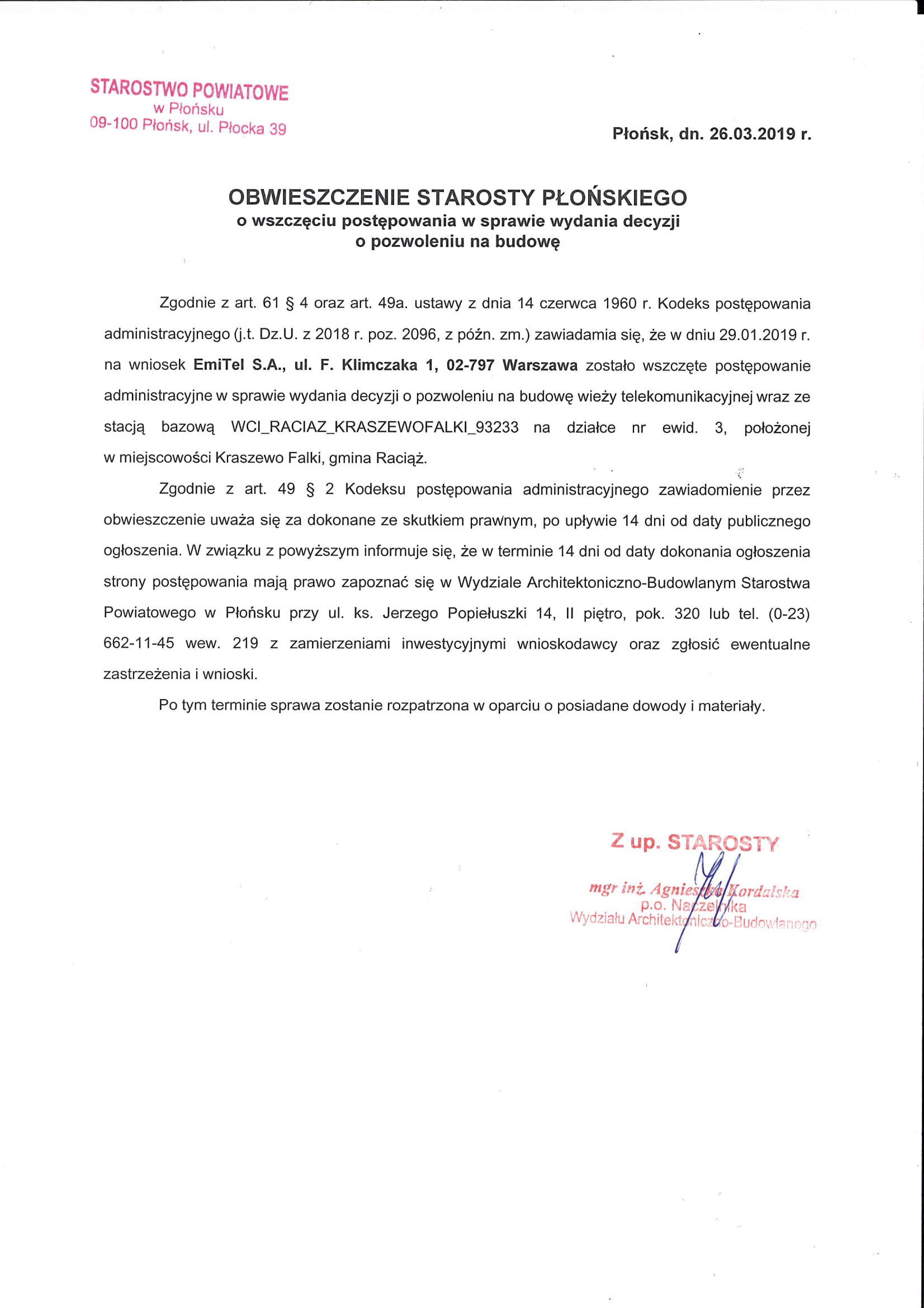 Obwieszczenie Starosty Płońskiego o wszczęcie postępowania w sprawie wydania decyzji o pozwolenie na budowę