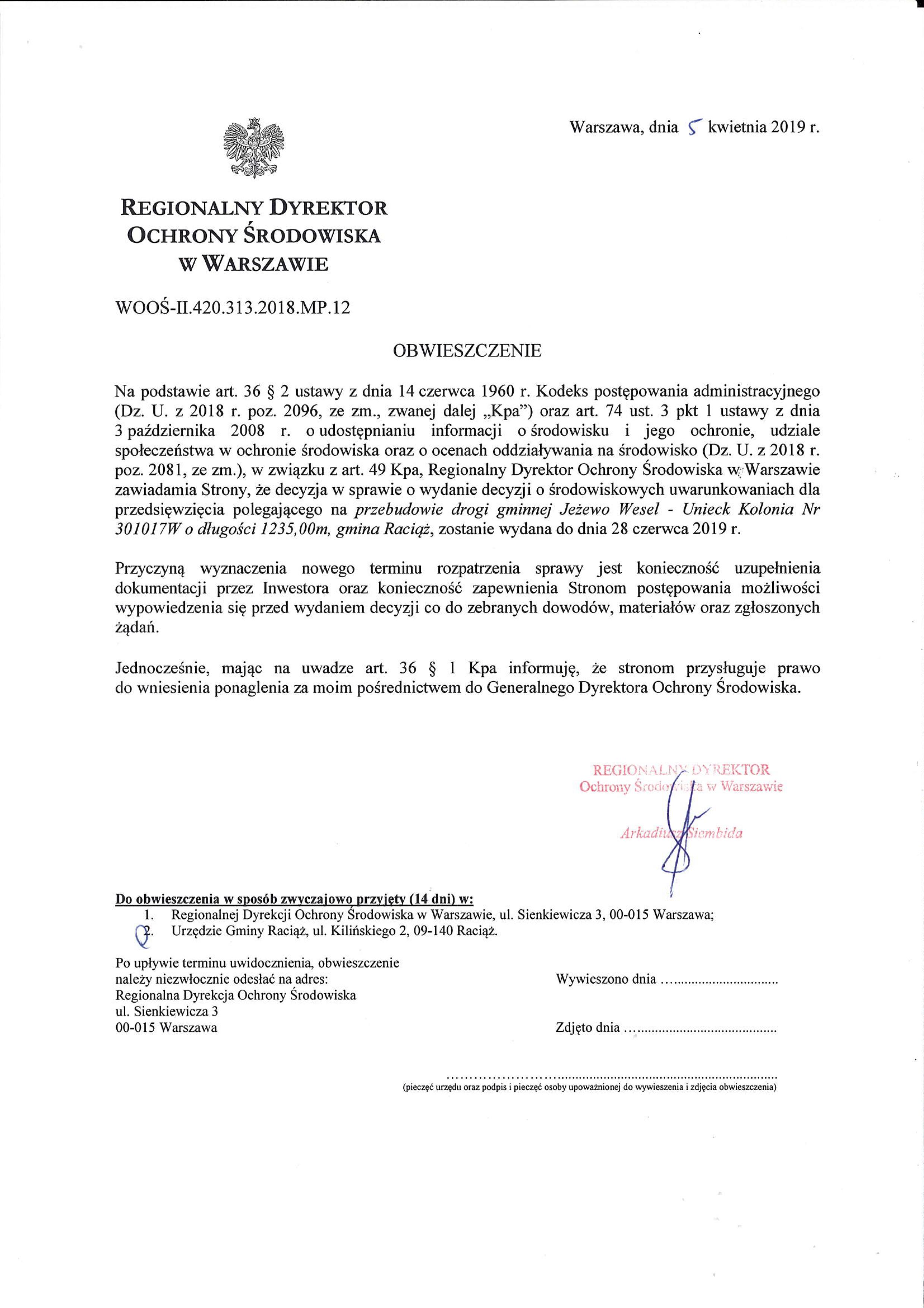 Obwieszczenie RDOŚ w Warszawie w sprawie przedłużenie terminu wydania decyzji o środowiskowych uwarunkowaniach dla przedsięwzięcia polegającego na przebudowie drogi gminnej Jeżewo Wesel – Unieck Kolonia Nr 301017W