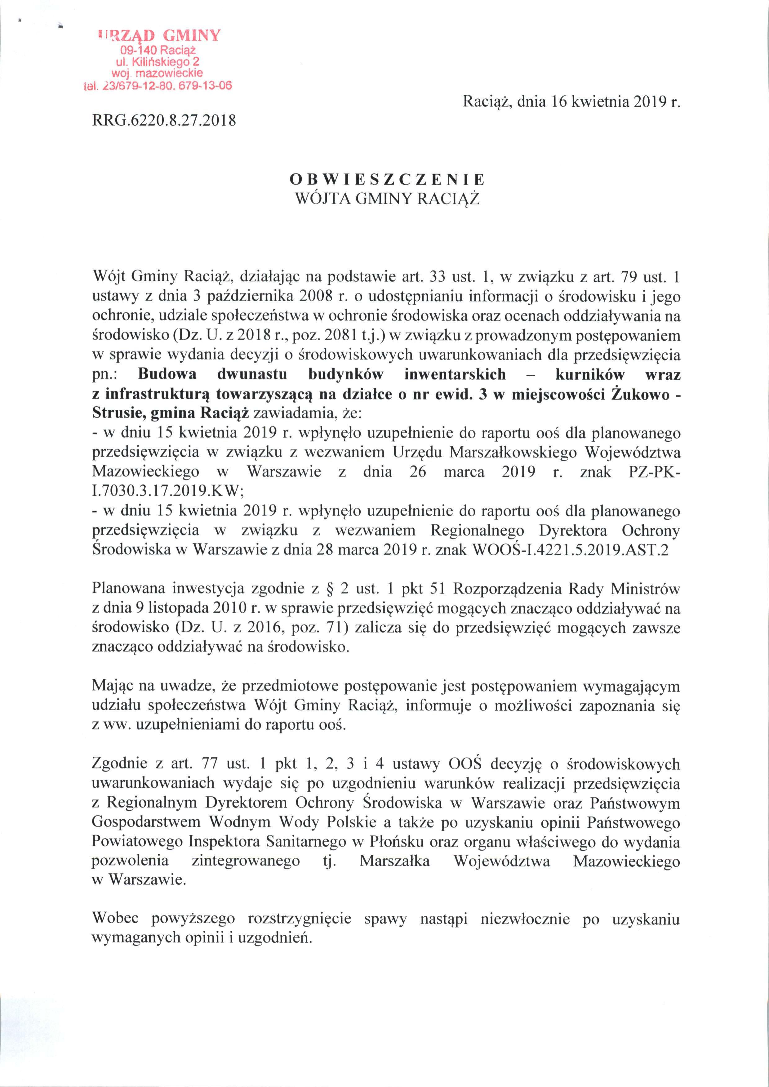 Budowa dwunastu budynków inwentarskich – kurników wraz z infrastrukturą towarzyszącą na działce o nr ewid. 3 w miejscowości Żukowo -Strusie, gmina Raciąż