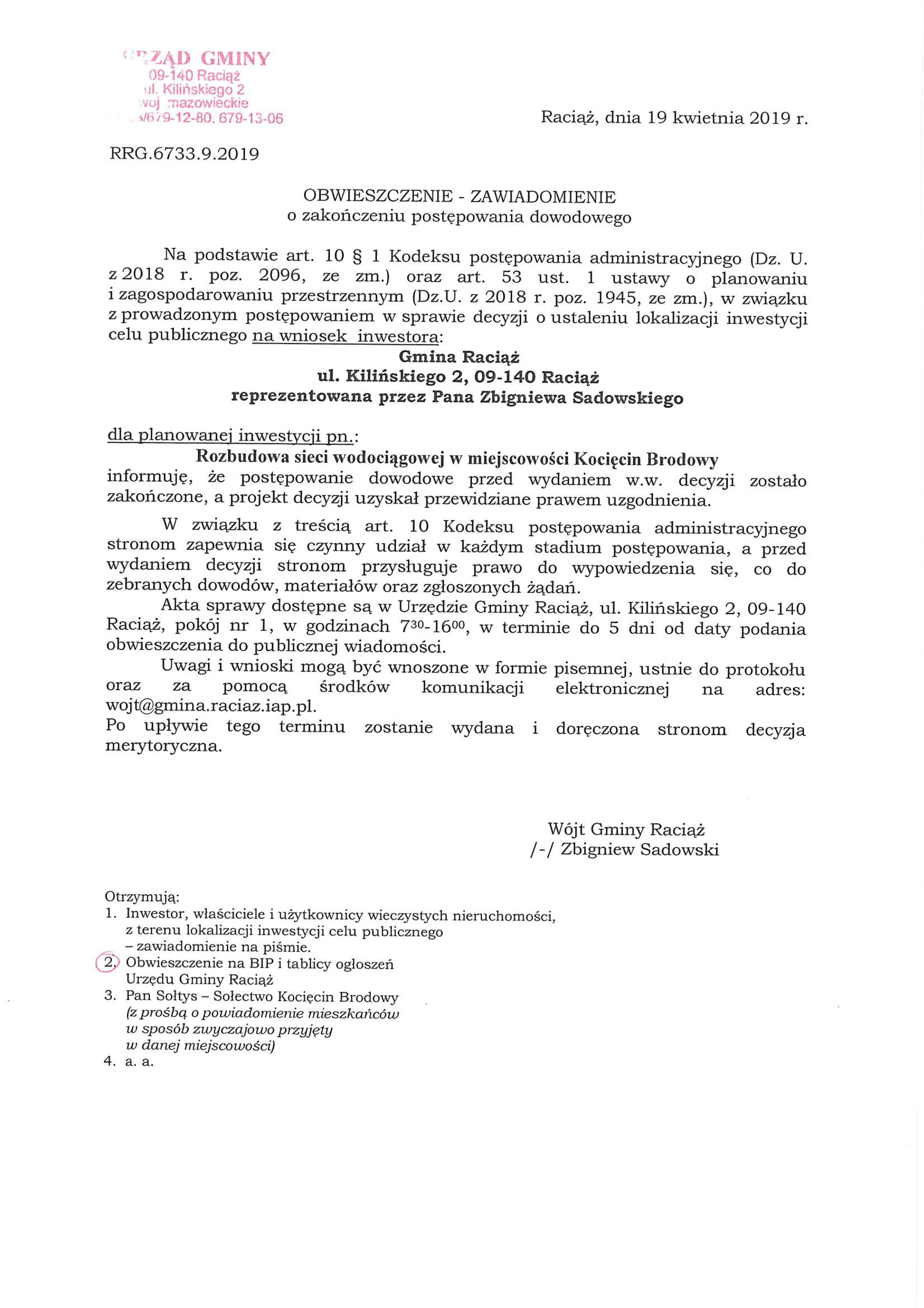 Obwieszczenie – zakończenie postępowania - Rozbudowa sieci wodociągowej w m. Kocięcin Brodowy
