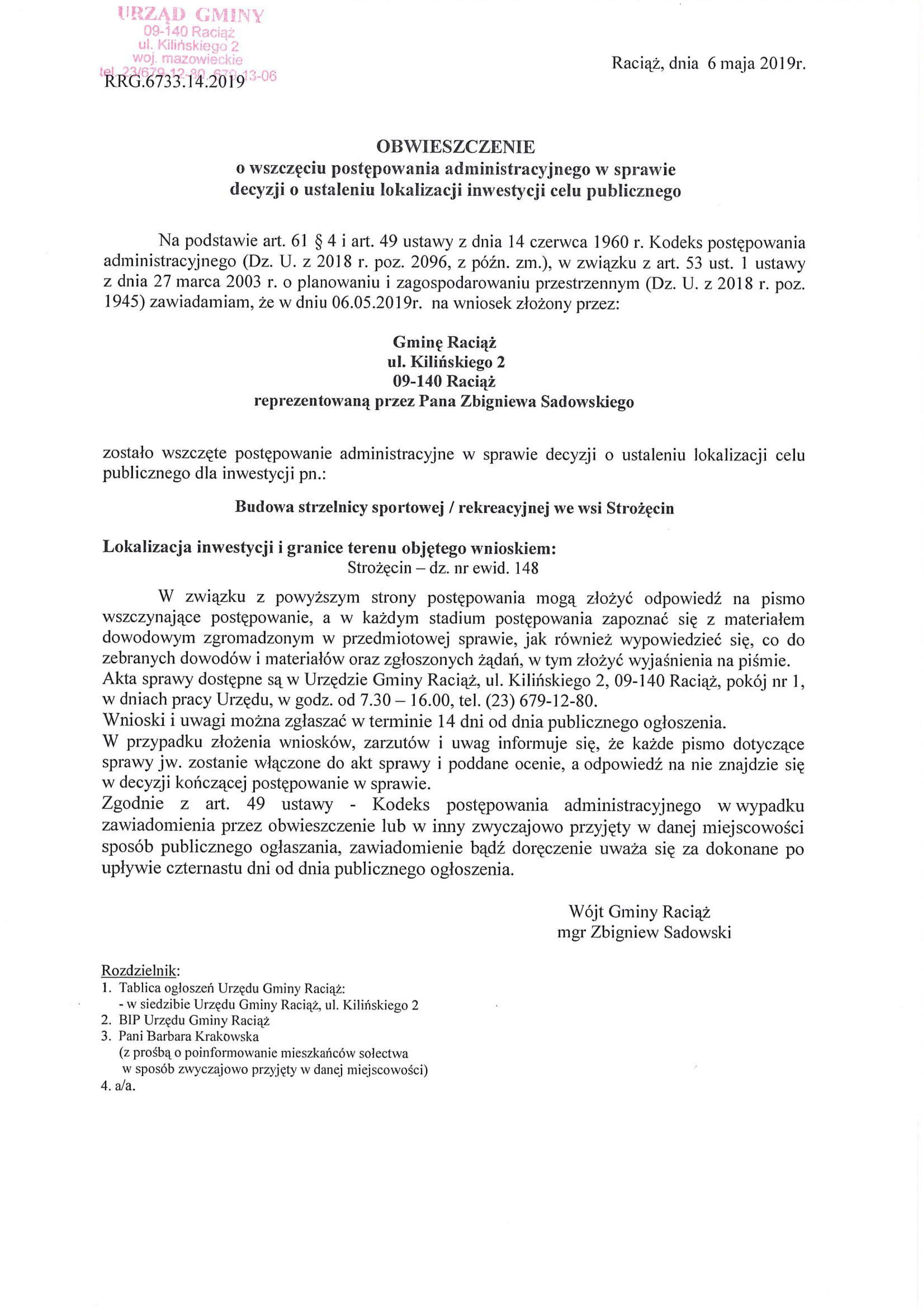 Obwieszczenie o wydaniu decyzji celu publicznego - Budowa strzelnicy sportowej / rekreacyjnej we wsi Strożęcin