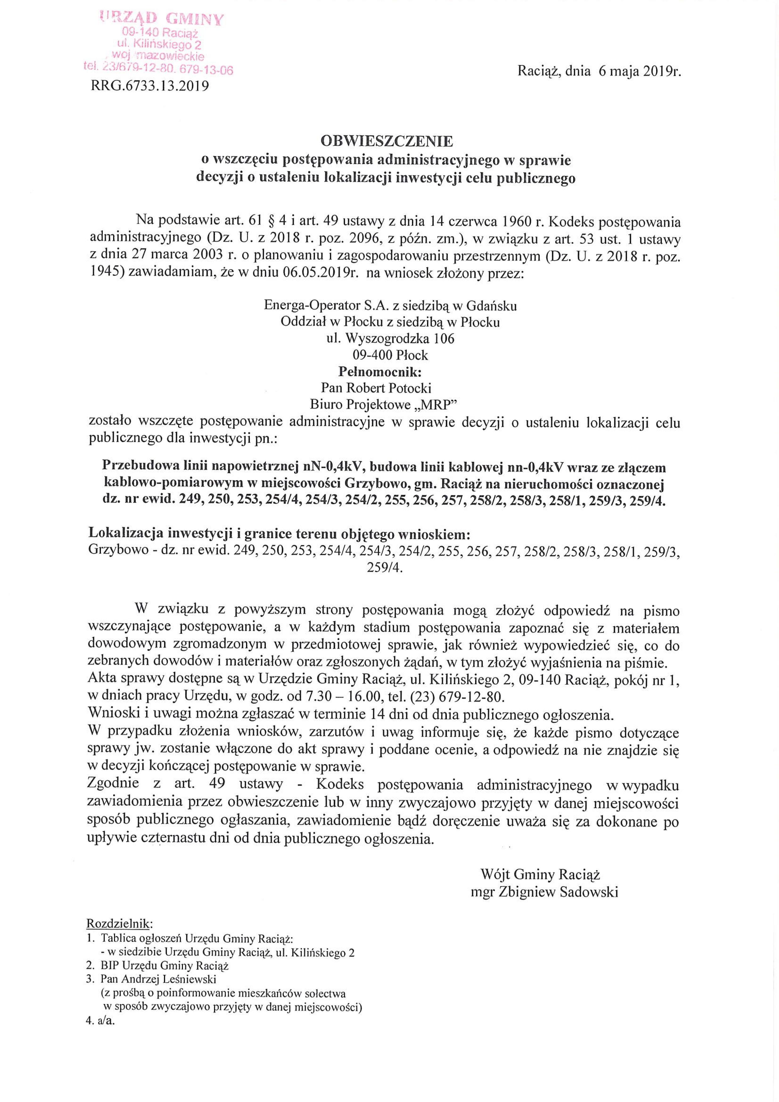 1. Obwieszczenie o wydaniu decyzji celu publicznego - Linia energetyczna Grzybowo