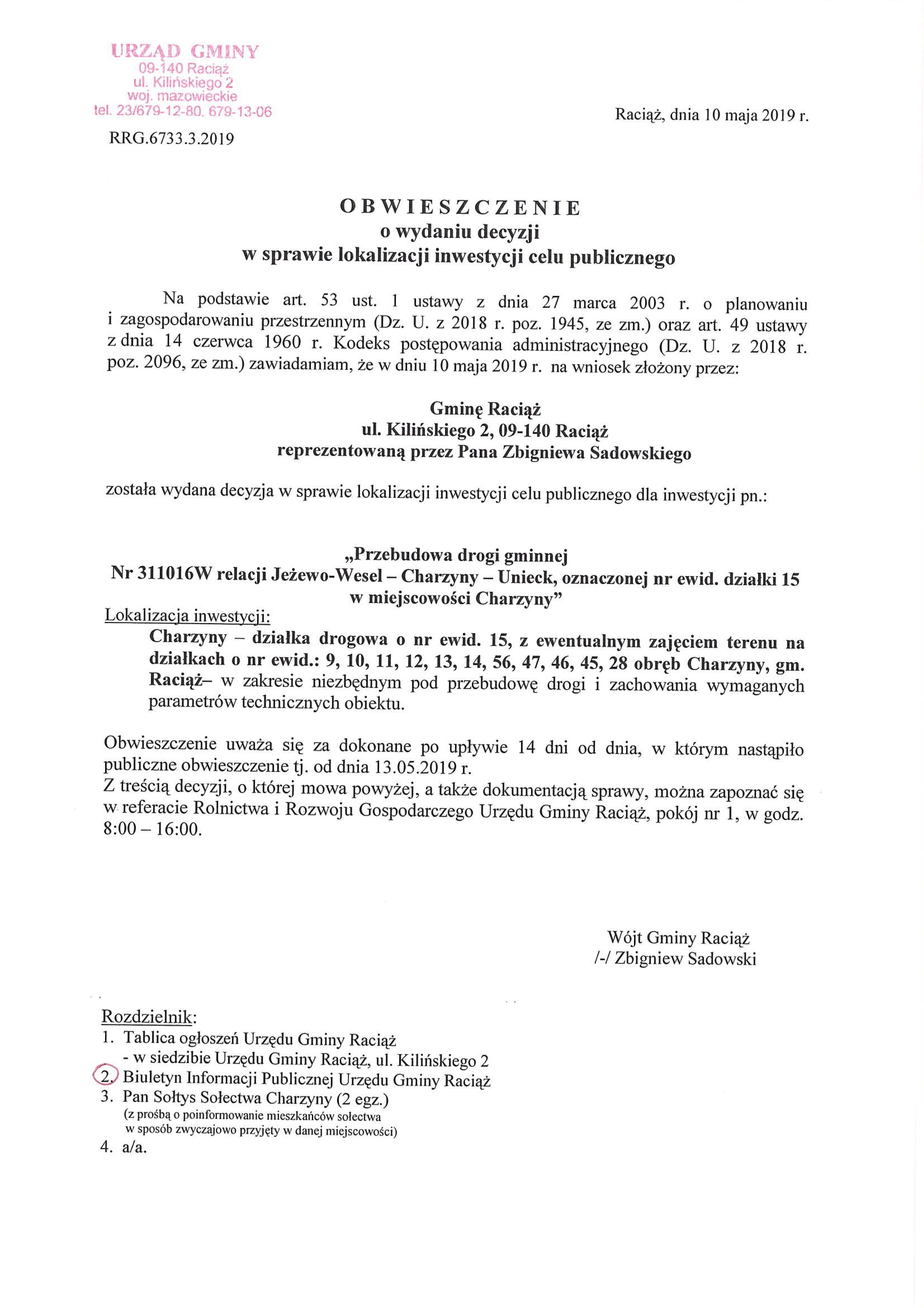 Obwieszczenie o wydaniu decyzji celu publicznego Przebudowa drogi gminnej Nr 311016W – działka nr ewid. 15 w m. Charzyny