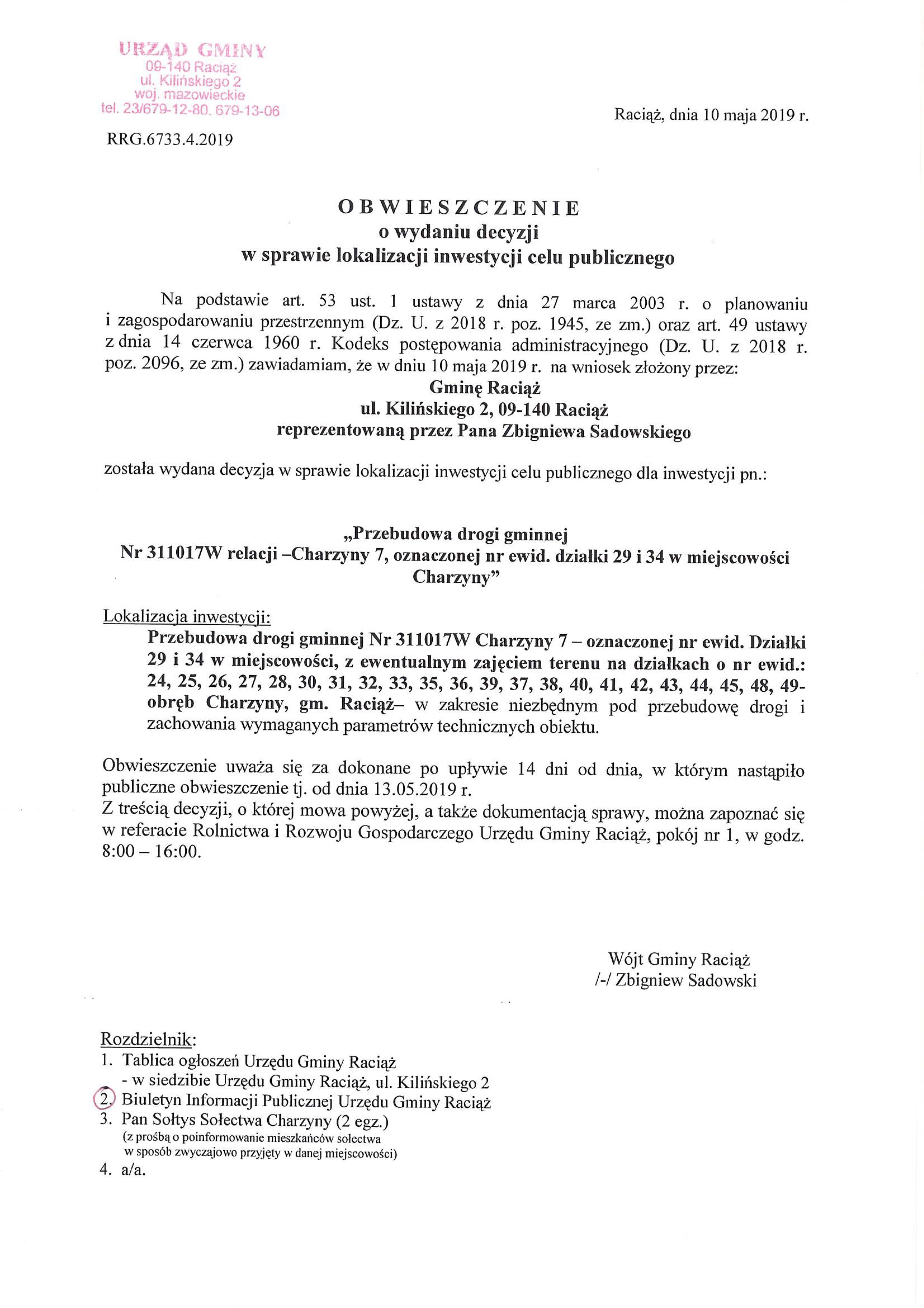 Obwieszczenie o wydaniu decyzji celu publicznego Przebudowa drogi gminnej Nr 311017W Charzyny 7 - działki nr ewid. 29 i 34 w miejscowości Charzyny