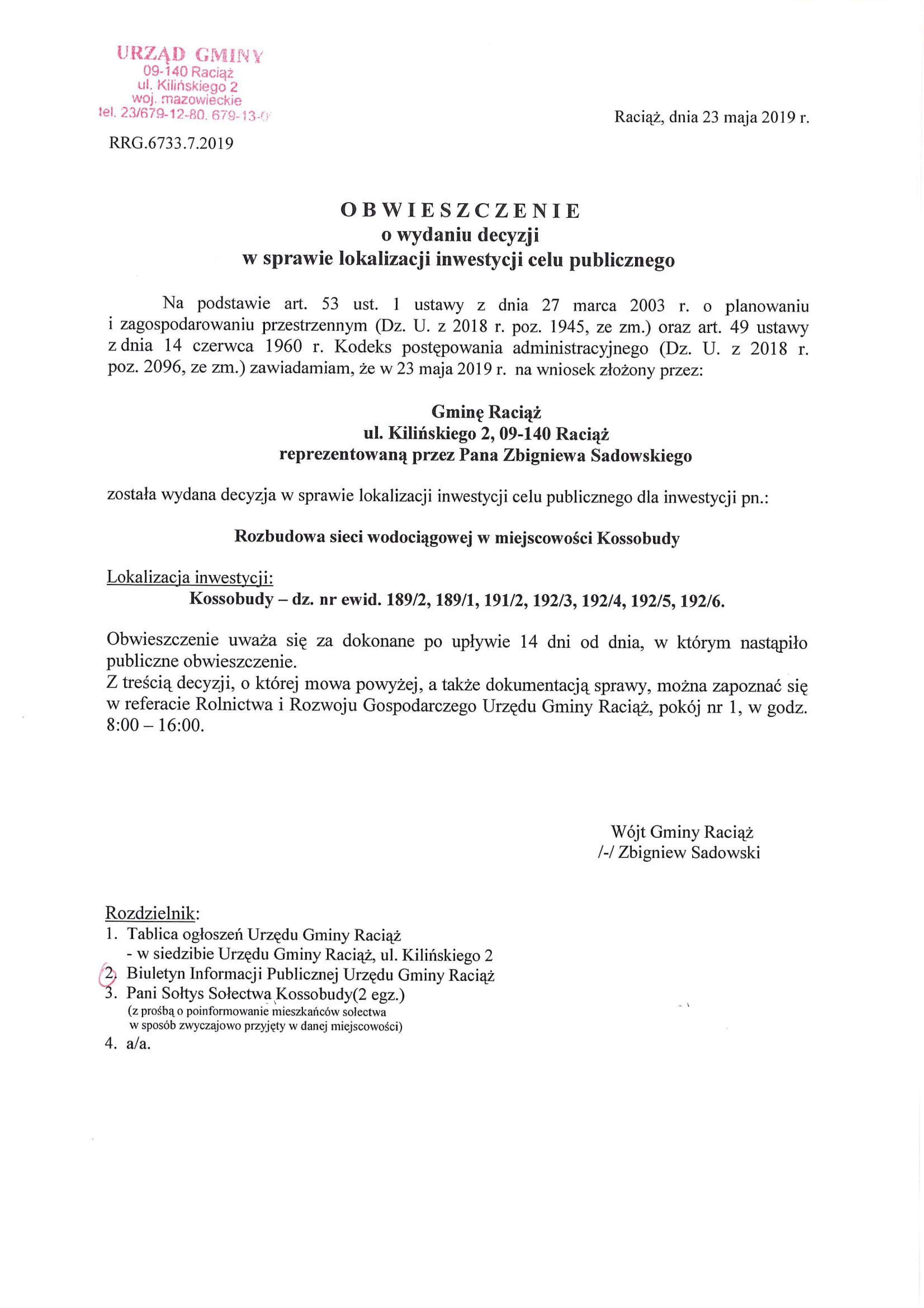 wodociąg Kossobudy – obwieszczenie o wydaniu decyzji – lokalizacja inwestycji celu publicznego