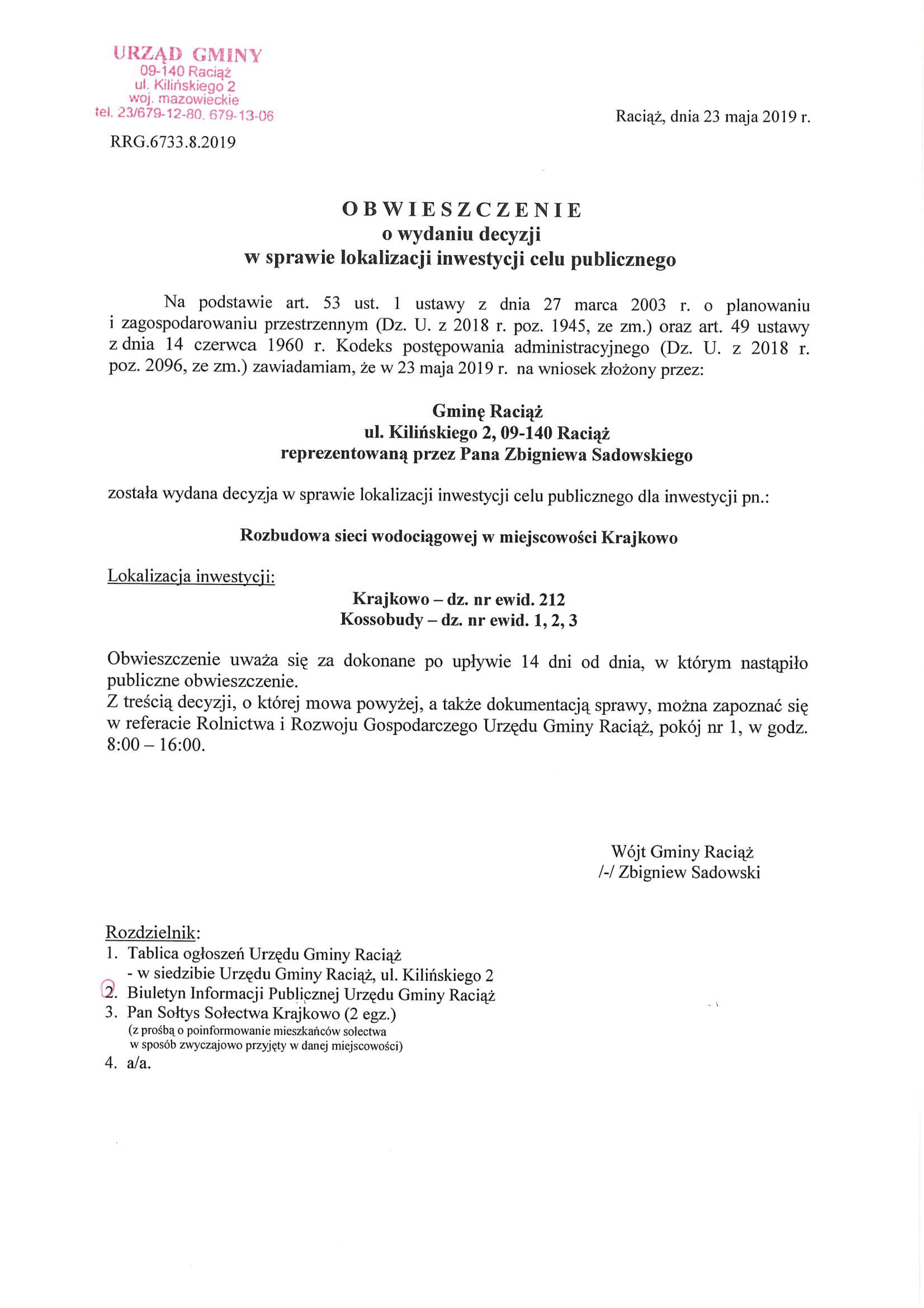 wodociąg Krajkowo - obwieszczenie o wydaniu decyzji – lokalizacja inwestycji celu publicznego