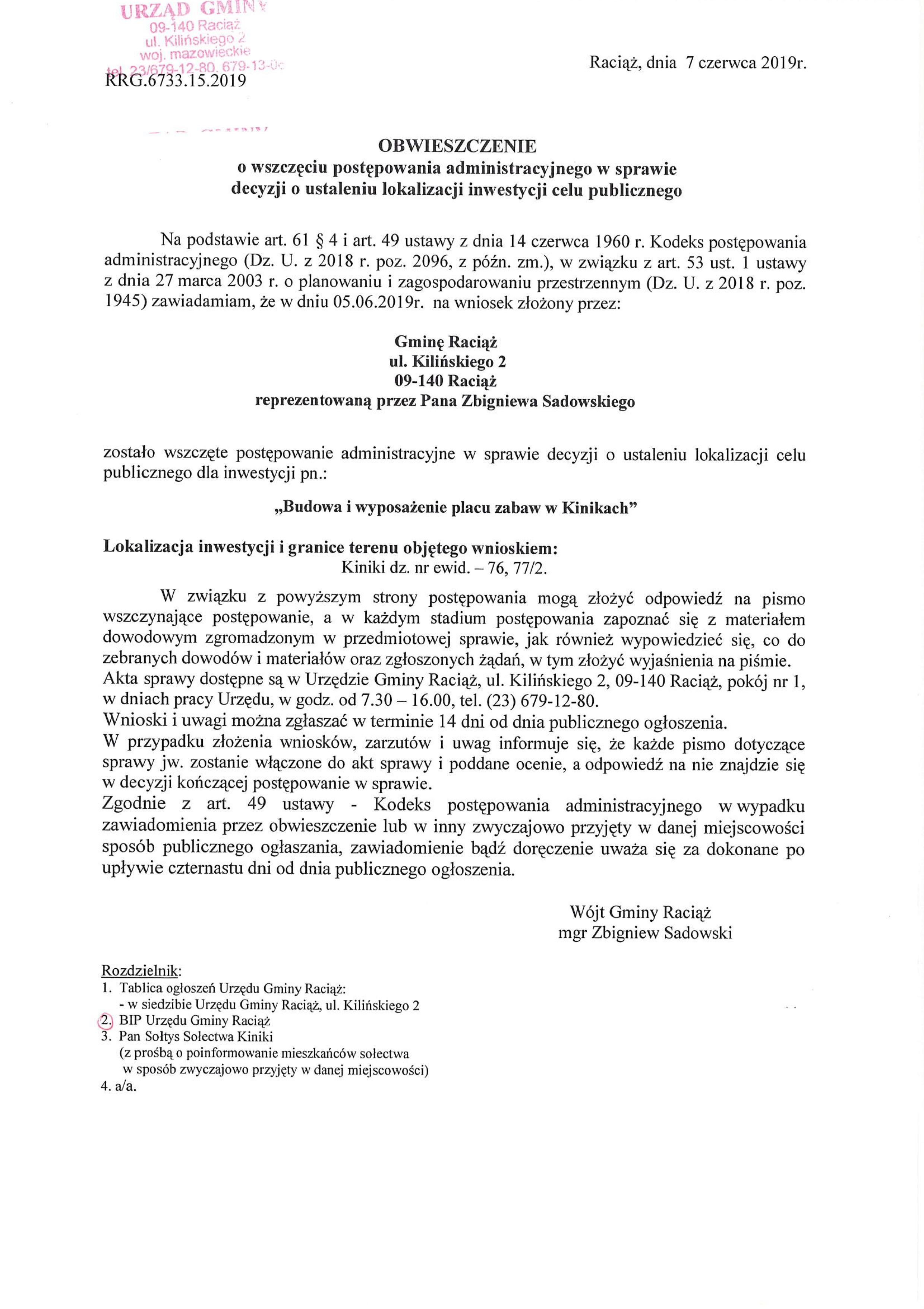Obwieszczenie-wszczęcie postępowania - cel publiczny: “Budowa i wyposażenie placu zabaw w Kinikach”