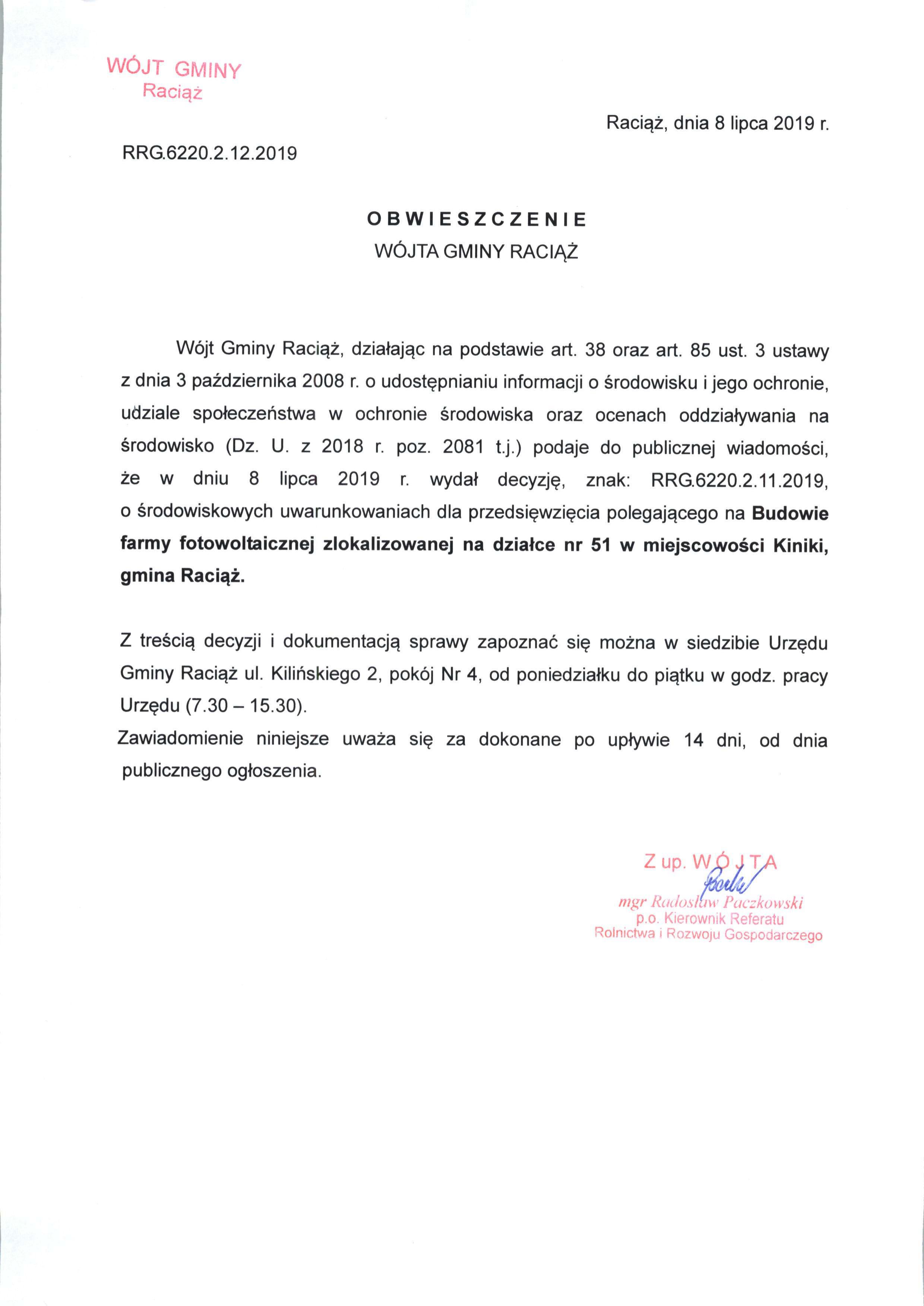 Budowa farmy fotowoltaicznej zlokalizowanej na działce nr 51 w miejscowości Kiniki, gmina Raciąż