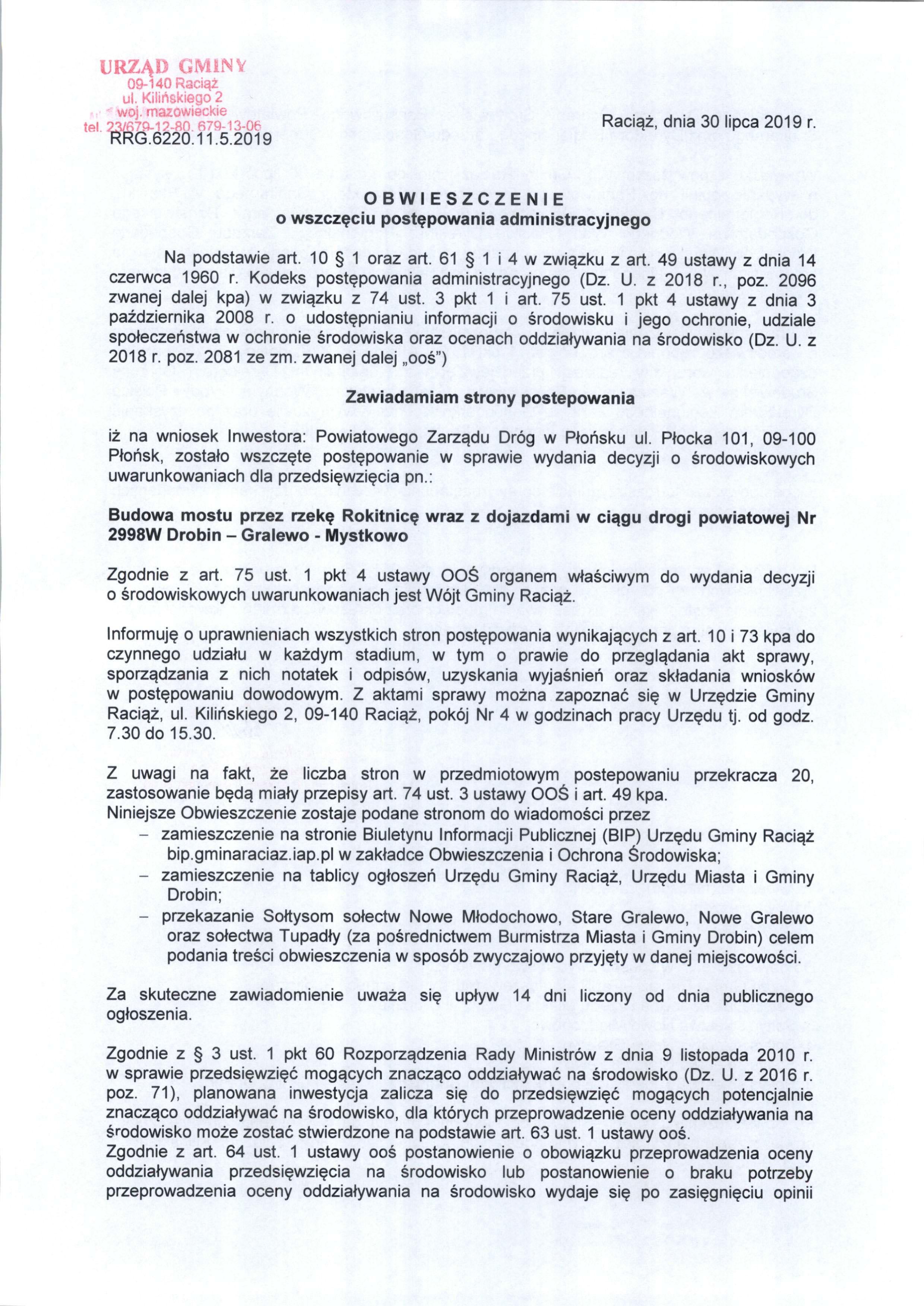 Budowa mostu przez rzekę Rokitnicę wraz z dojazdami w ciągu drogi powiatowej Nr 2998W Drobin – Gralewo – Mystkowo