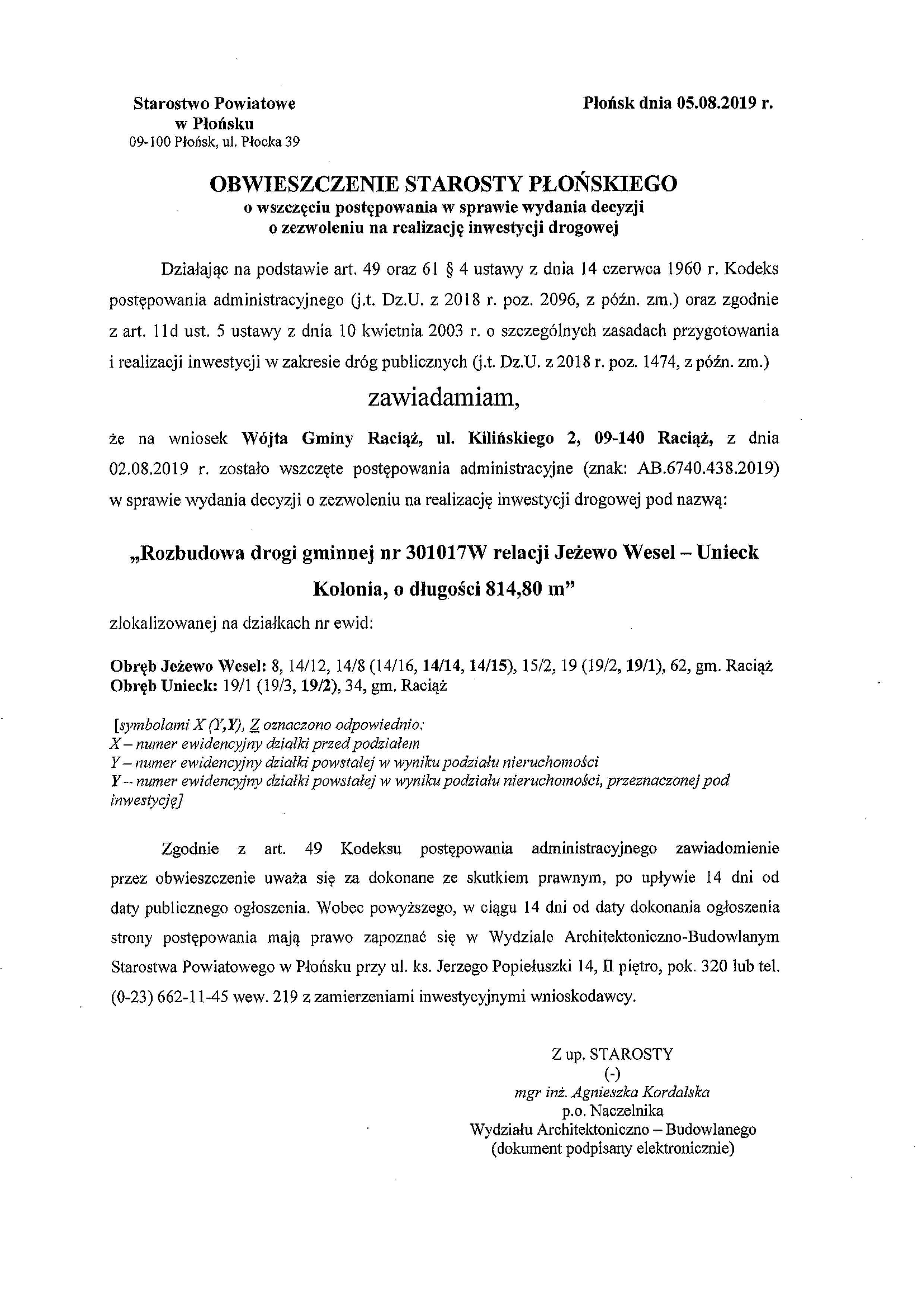 Obwieszczenie Starosty Płońskiego o wszczęciu postępowania w sprawie wydania decyzji o zezwoleniu na realizację inwestycji drogowej pod nazwą „ Rozbudowa drogi gminnej Nr 301017W relacji Jeżewo Wesel – Unieck Kolonia, o długości 814,80 m”.