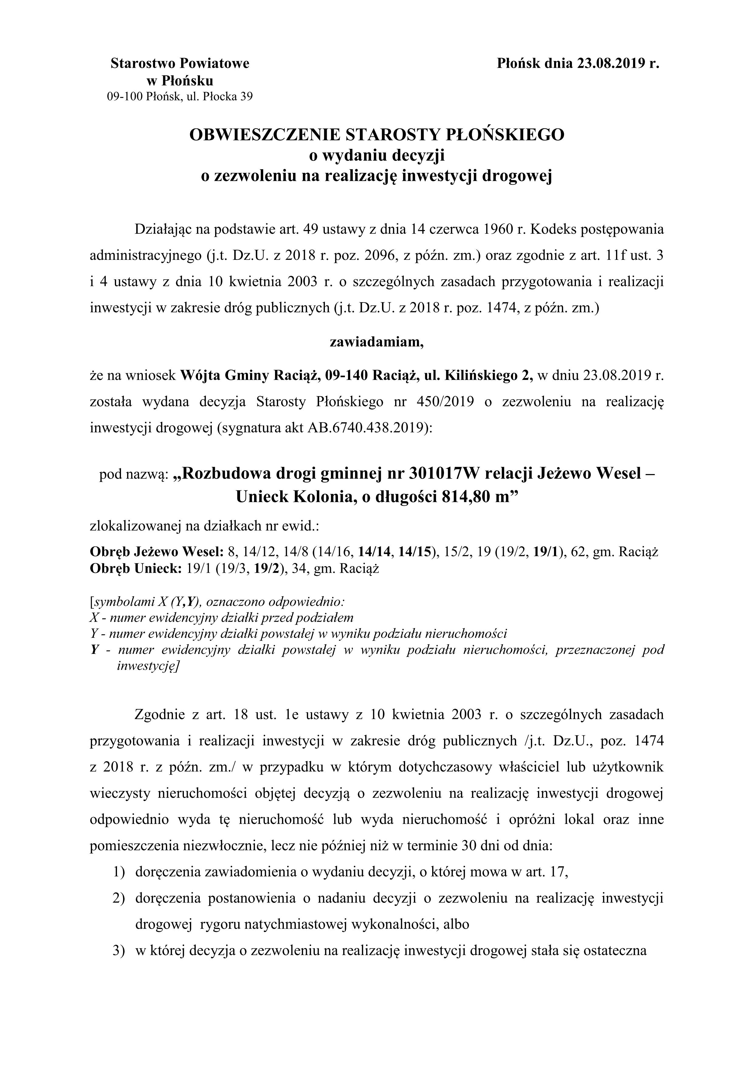 Obwieszczenie Starosty Płońskiego o wydaniu decyzji o zezwoleniu na realizację inwestycji drogowej pod nazwą: „Rozbudowa drogi gminnej Nr 301017W relacji Jeżewo Wesel – Unieck Kolonia, o długości 814,80 m”