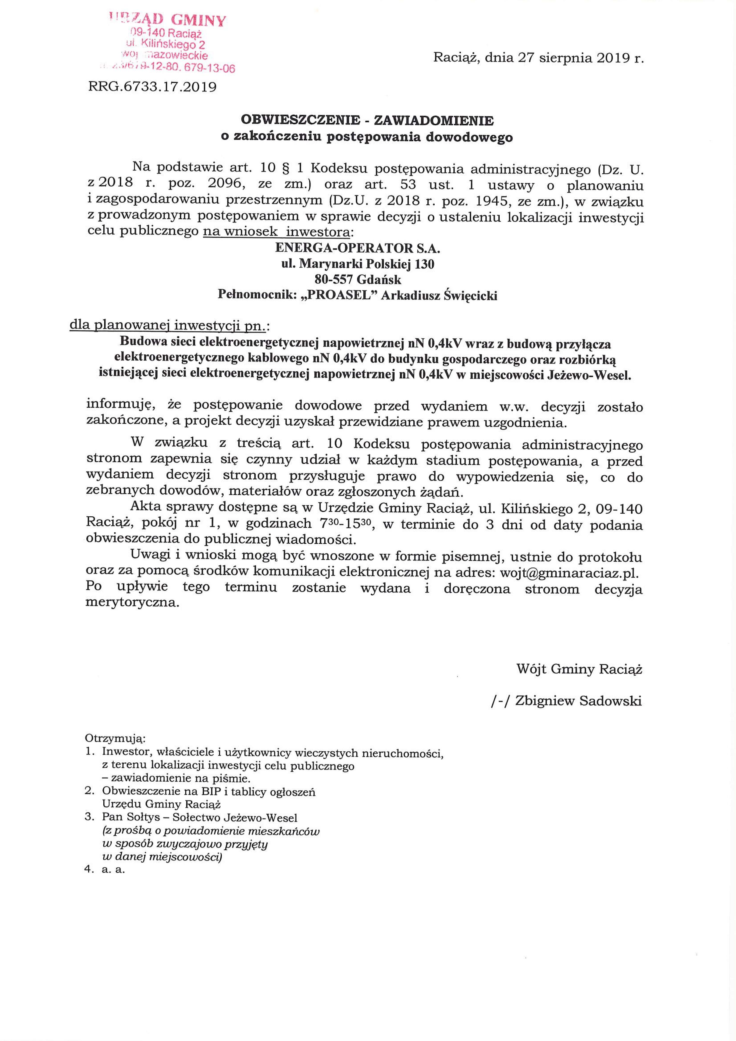 Cel publiczny –obwieszczenie o zakończeniu postępowania: Budowa sieci energetycznej Jeżewo-Wesel