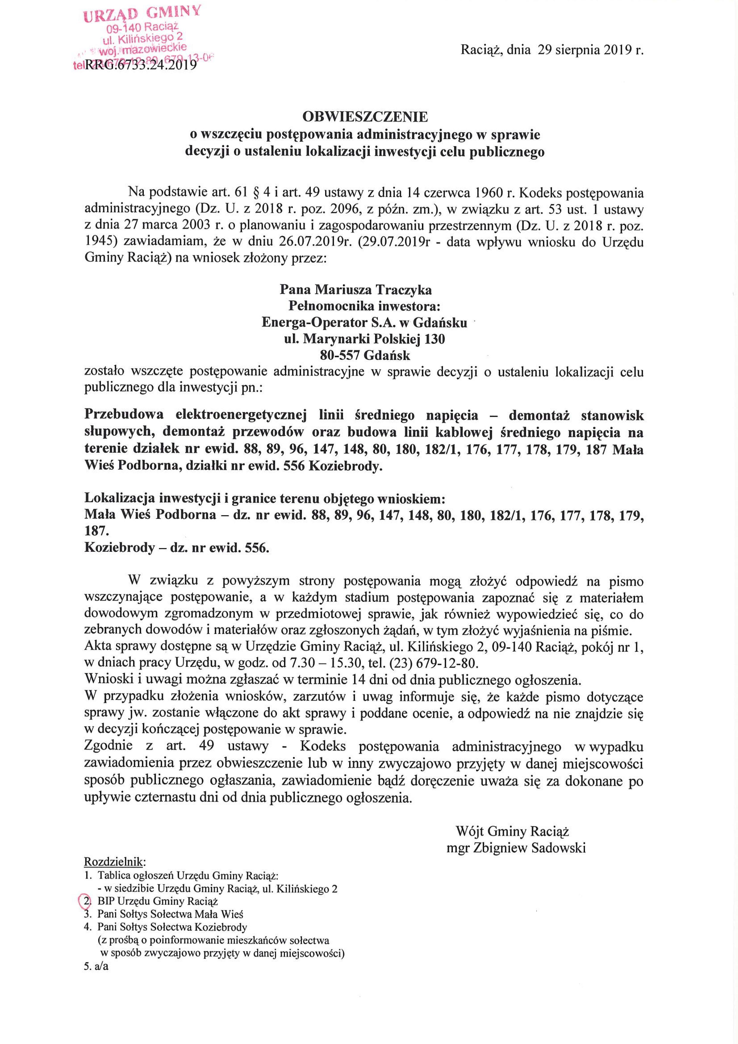 Cel publiczny - wszczęcie postępowania “Przebudowa linii elektroenergetycznej – Mała Wieś, Koziebrody”