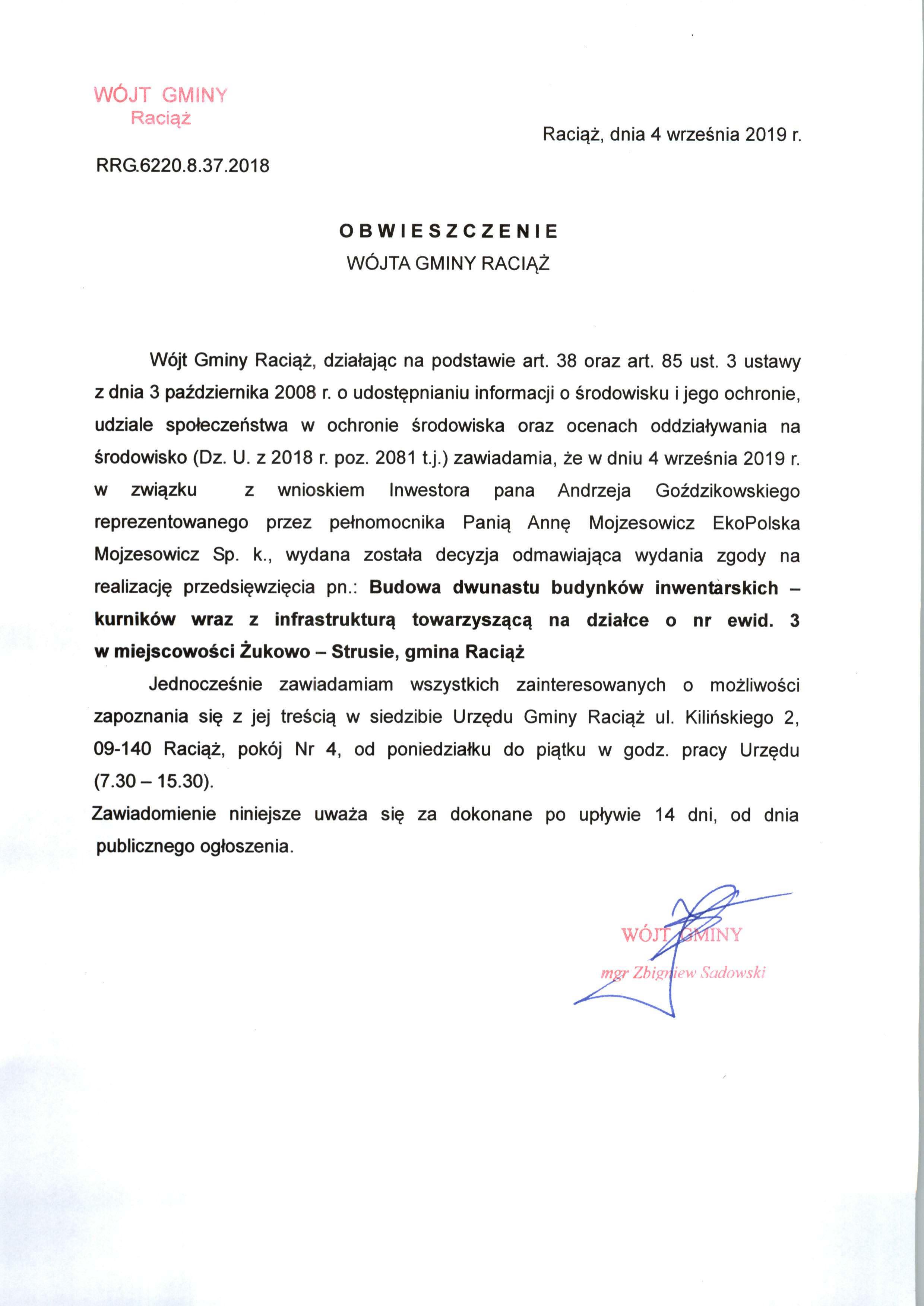 Budowa dwunastu budynków inwentarskich – kurników wraz z infrastrukturą towarzyszącą na działce o nr ewid. 3 w miejscowości Żukowo – Strusie, gmina Raciąż