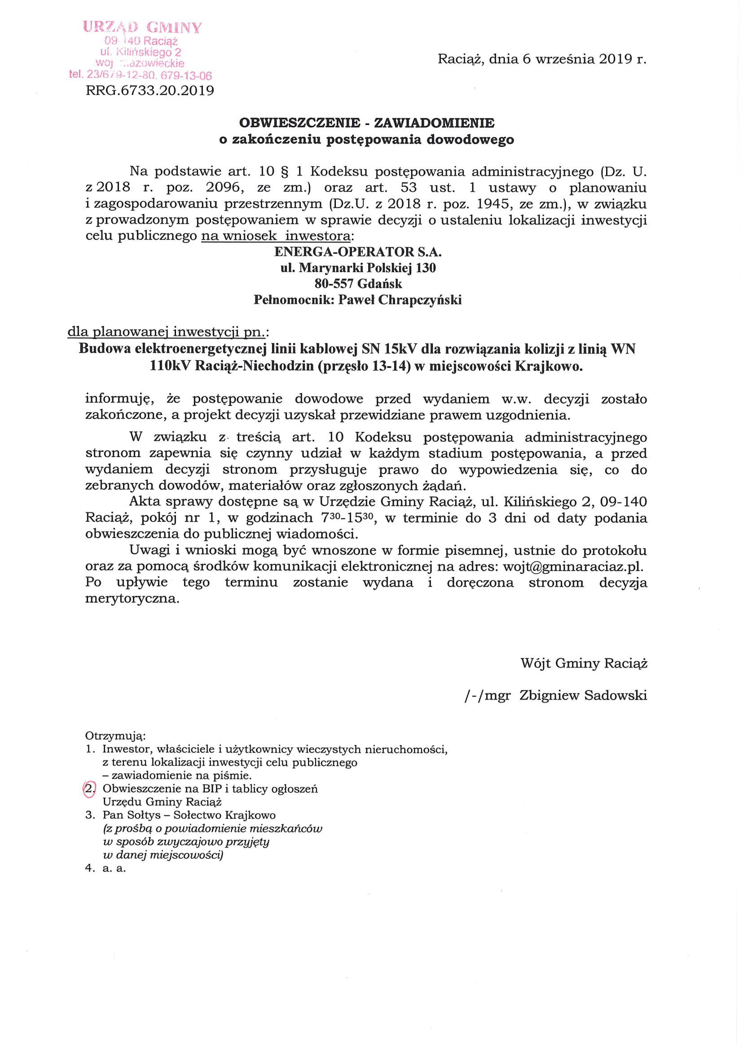 20.2019 Cel publiczny – zakończenie: Budowa elektroenergetycznej linii kablowej SN 15kV m.Krajkowo