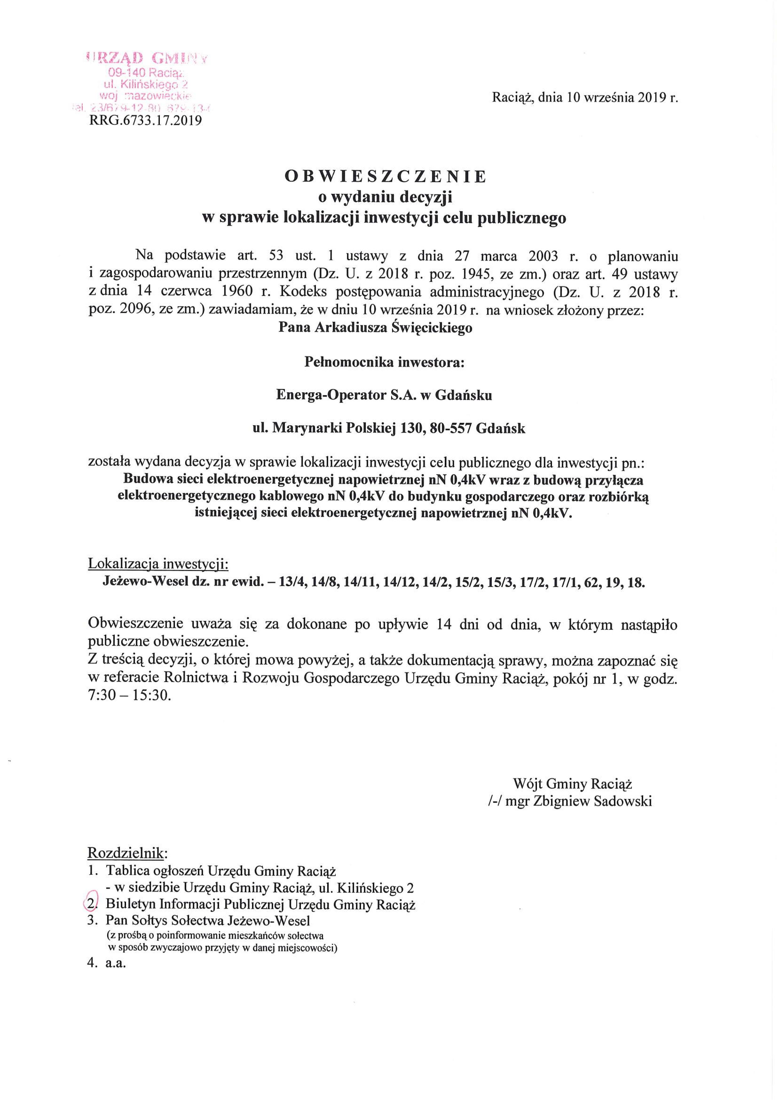 17.2019 Cel publiczny - Obwieszczenie o wydaniu decyzji – BUDOWA SIECI ELEKTROENERGET. nN 0,4 kV JEŻEWO-WESEL