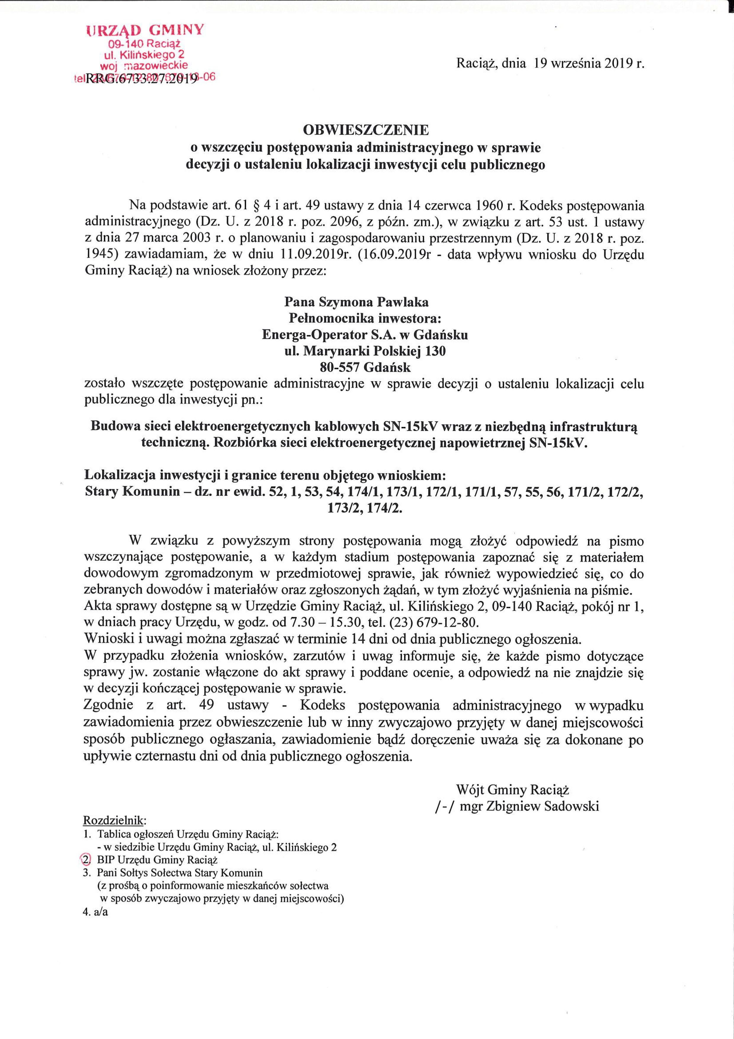 27.2019 Cel publiczny-wszczęcie postępowania: Budowa sieci elektroenergetyk. kablowych SN-15 kV Stary Komunin