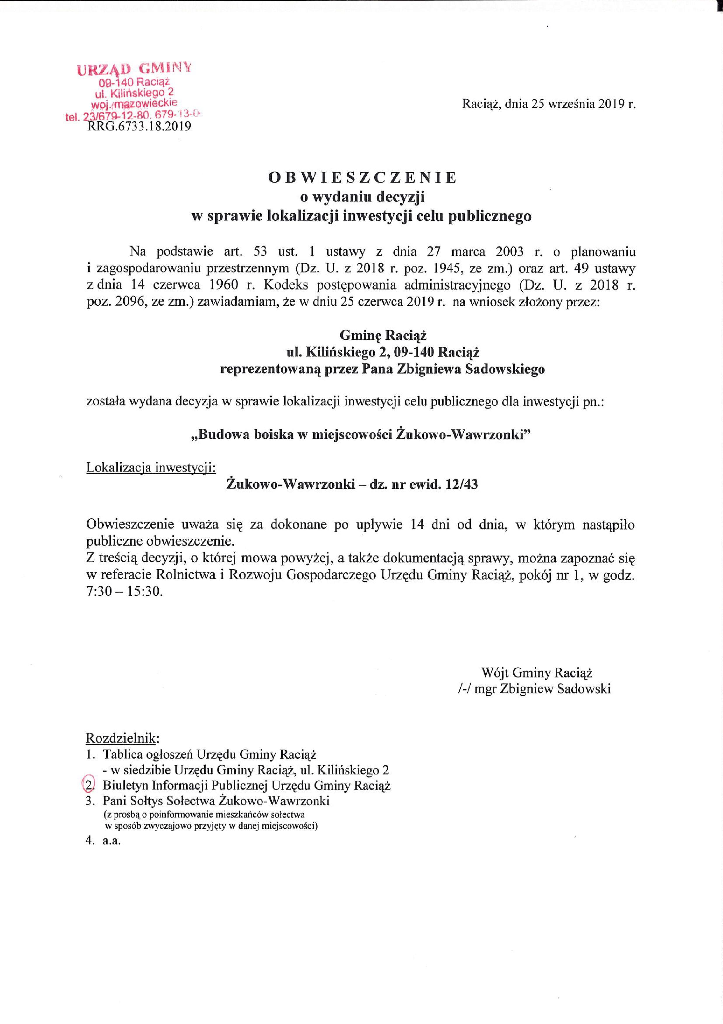 18.2019 Cel publiczny - Obwieszczenie o wydaniu decyzji – BUDOWA BOISKA W MIEJSCOWOŚCI ŻUKOWO-WAWRZONKI