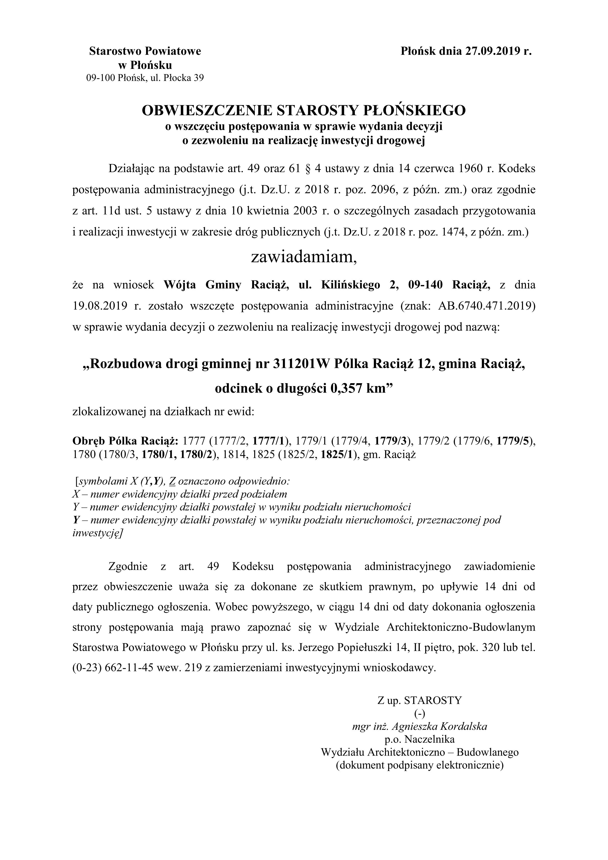 Obwieszczenie Starosty Powiatu Płońskiego – wszczęcie postępowania w sprawie decyzji o zezwoleniu na realizację inwestycji drogowej Rozbudowa drogi gminnej - Pólka Raciąż 12
