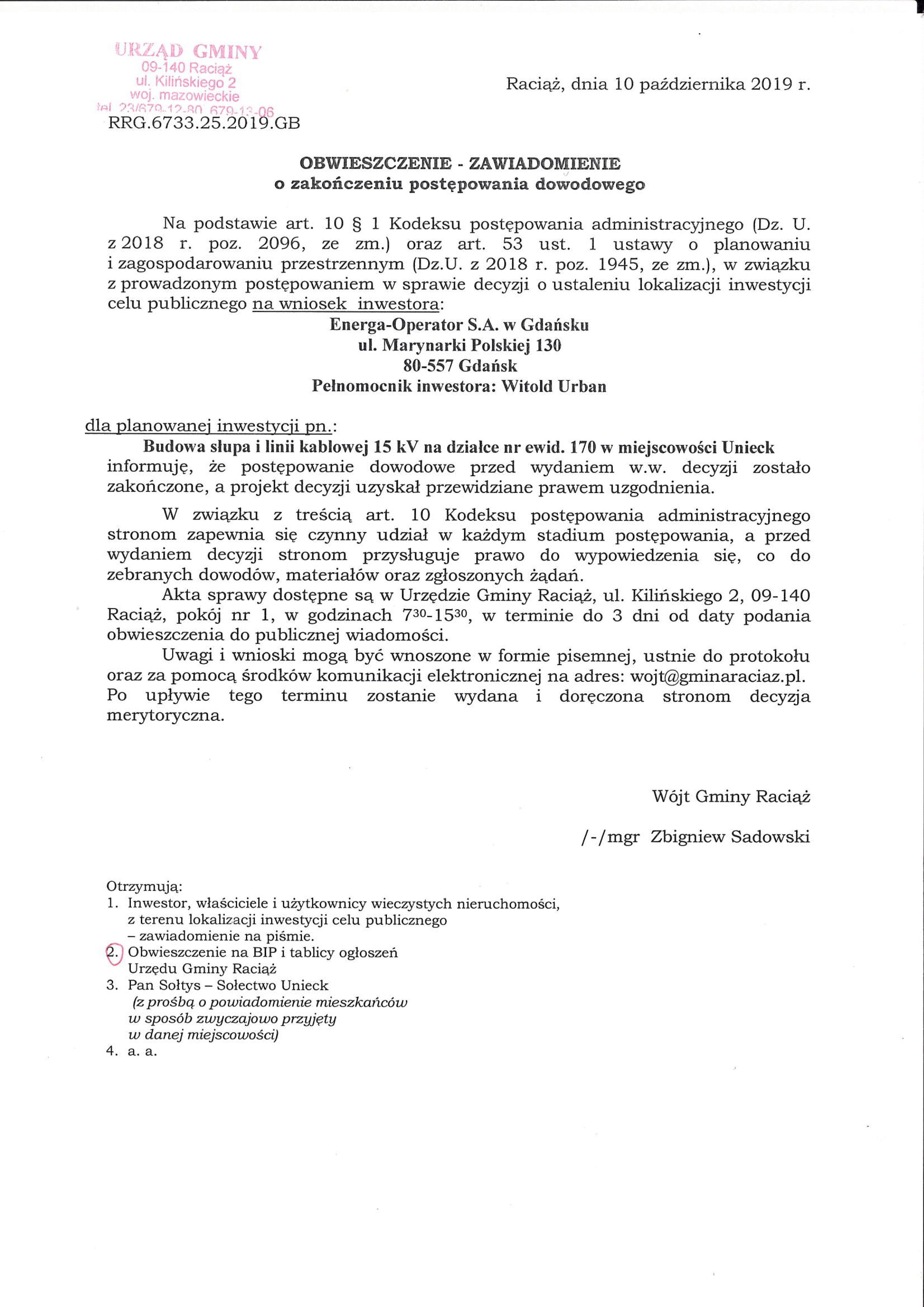 25.2019 Cel publiczny – Obwieszczenie o zakończeniu postępowania – Budowa słupa i linii kablowej 15 kV Unieck