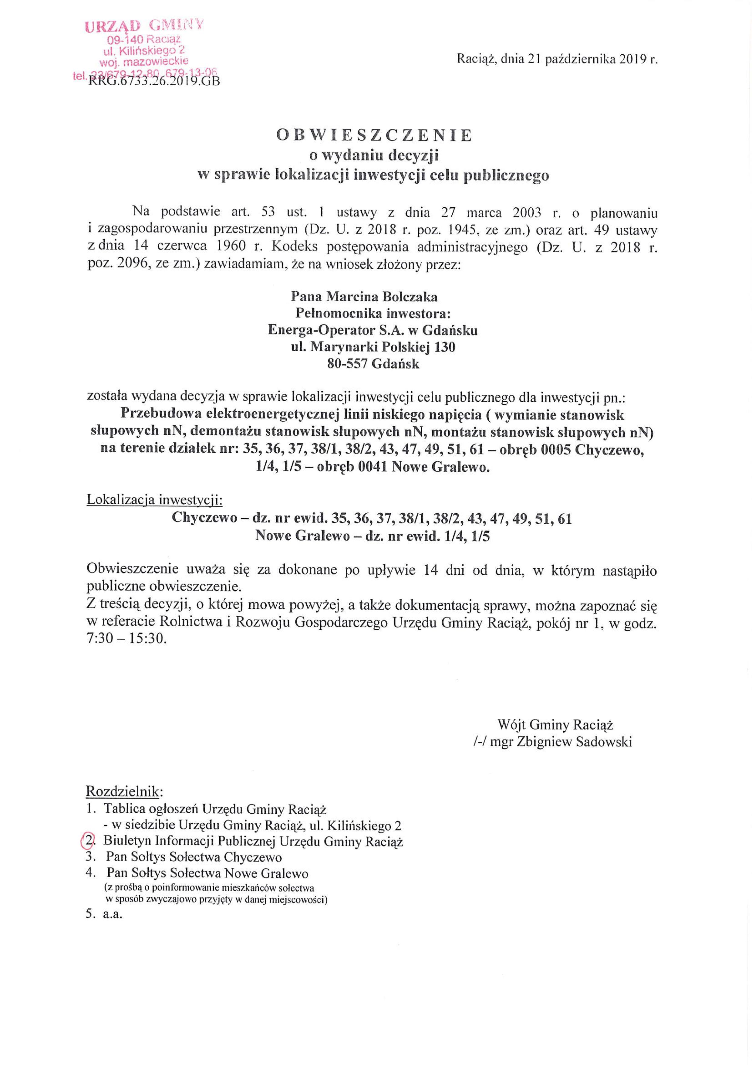 26.2019 Cel publiczny - Obwieszczenie o wydaniu decyzji – Przebudowa linii elektroenerget. Nowe Gralewo Chyczewo