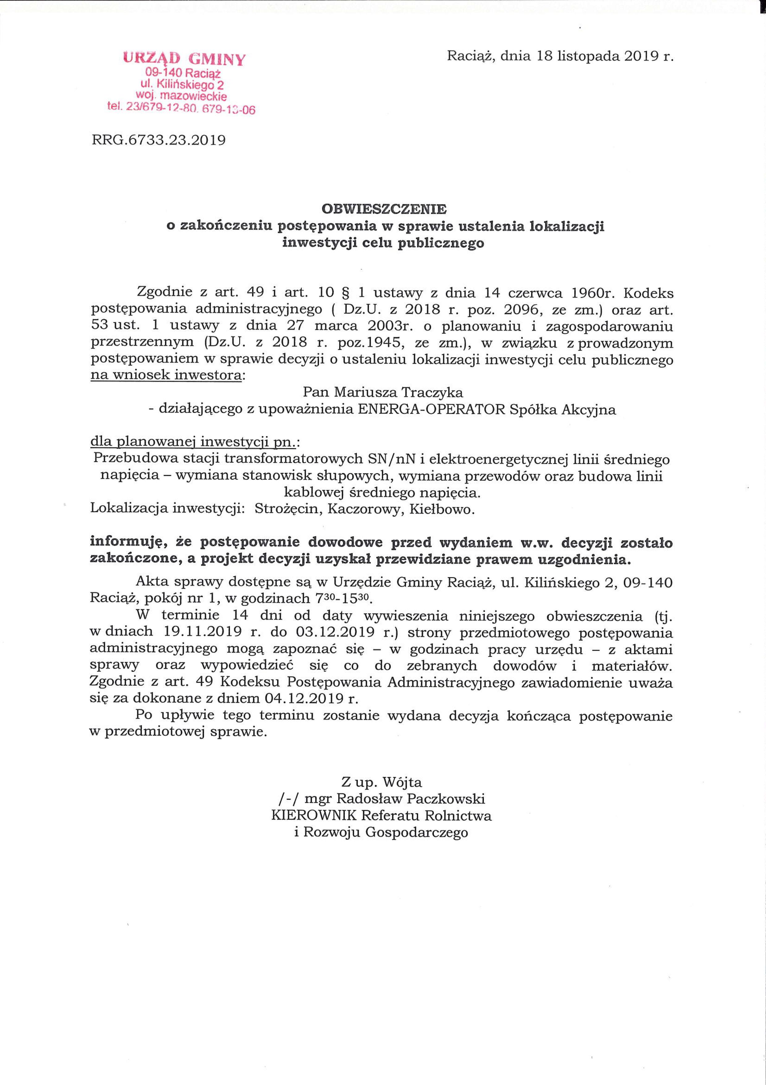 23.2019 Cel publiczny - Obwieszczenie o zakończeniu postępowania: Przebudowa stacji transformatorowych SN/nN i elektroenergetycznej linii średniego napięcia- Strożęcin, Kaczorowy, Kiełbowo.