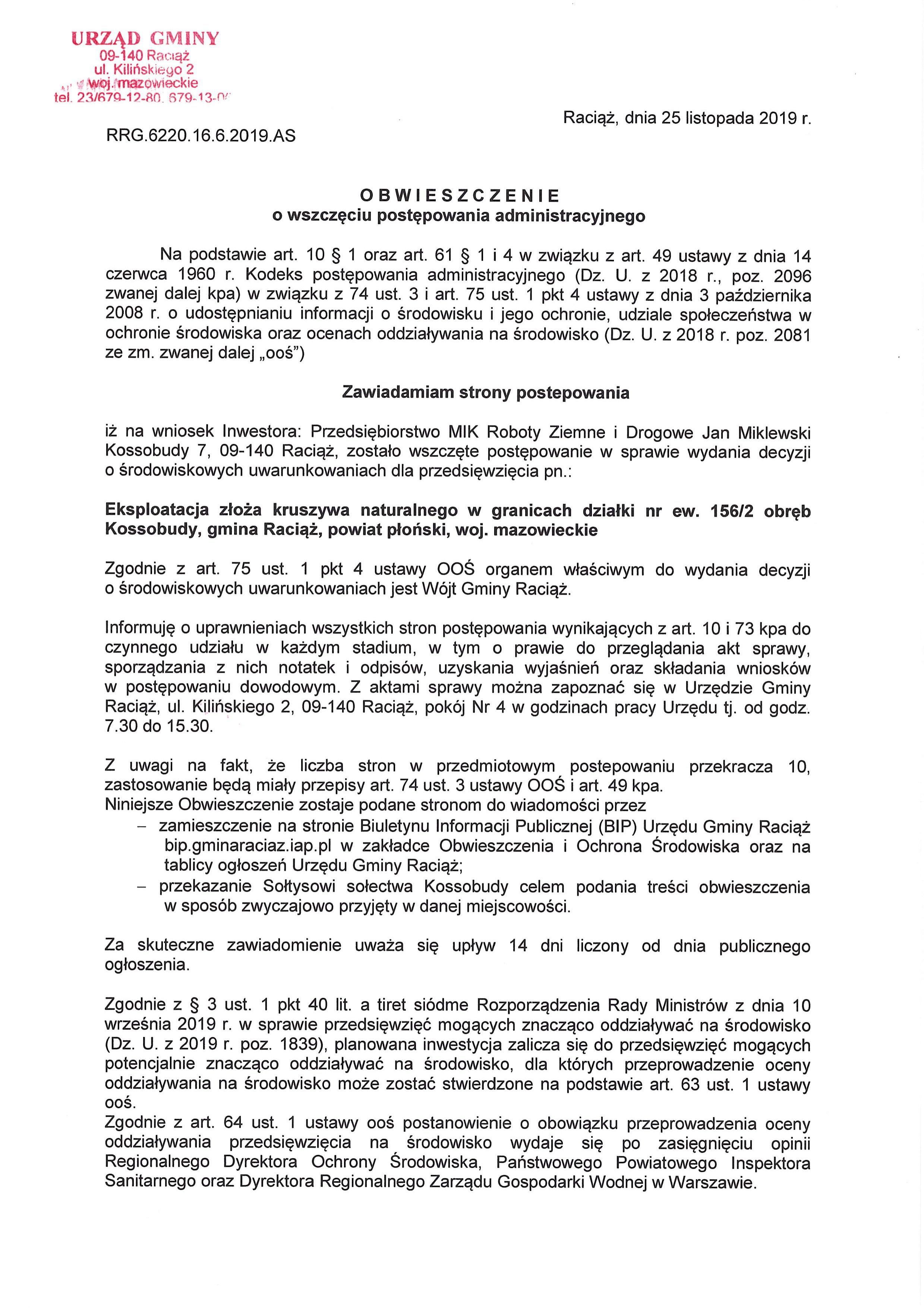 Eksploatacja złoża kruszywa naturalnego w granicach działki nr ew. 156/2 obręb Kossobudy, gmina Raciąż, powiat płoński, woj. mazowieckie