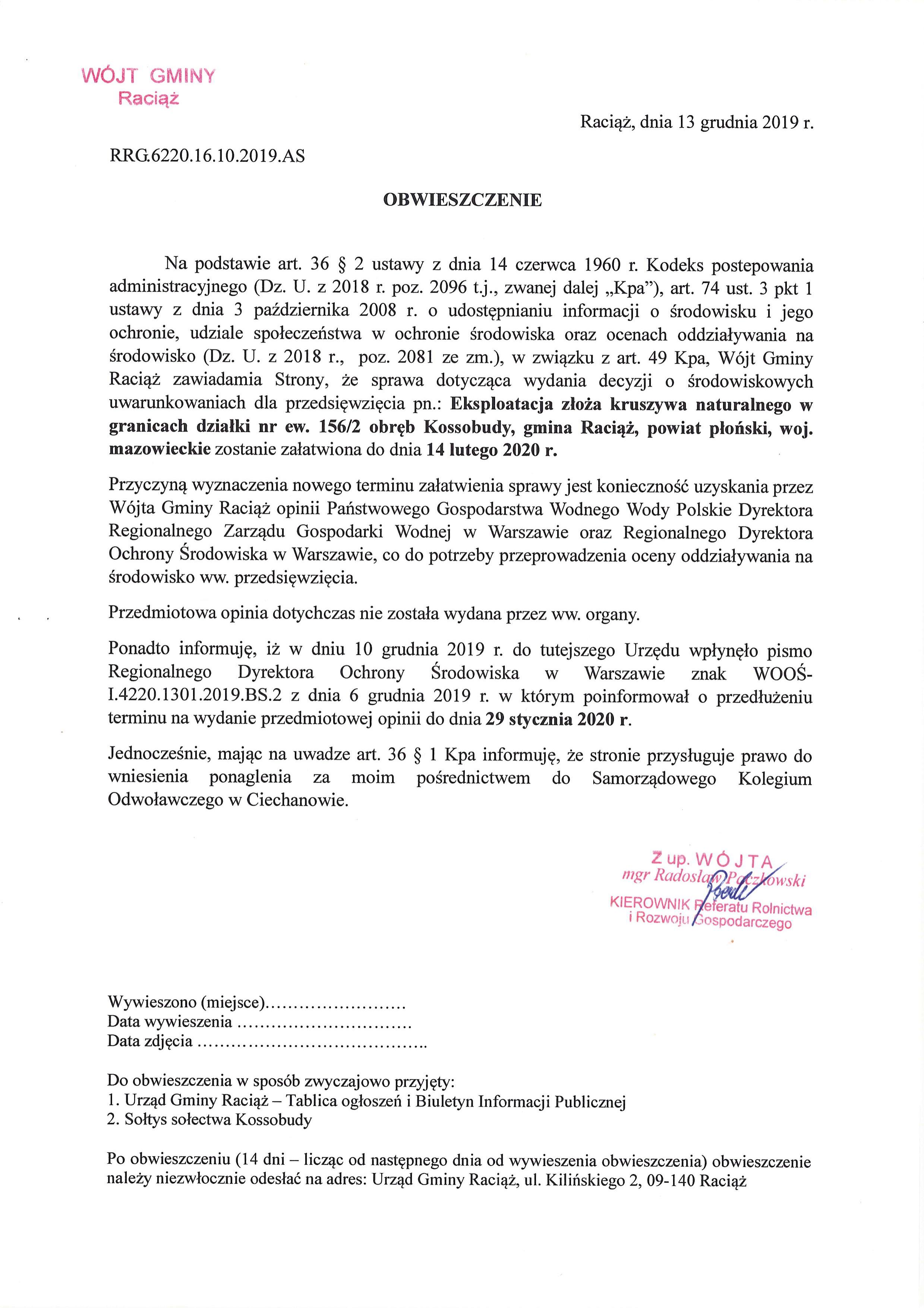 Eksploatacja złoża kruszywa naturalnego w granicach działki nr ew. 156/2 obręb Kossobudy, gmina Raciąż, powiat płoński, woj. mazowieckie