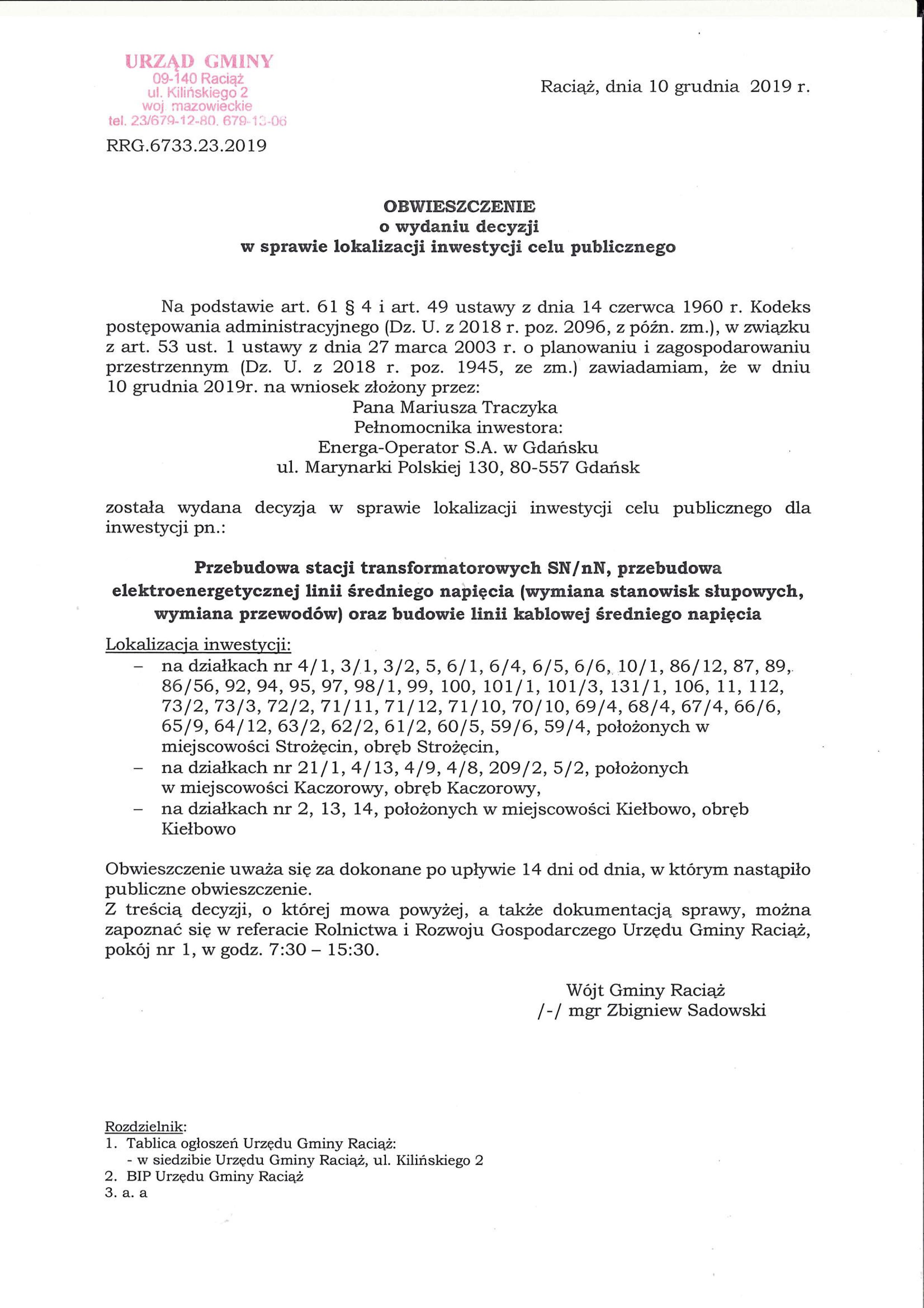 23.2019 Cel publiczny - Obwieszczenie o wydaniu decyzji. Przebudowa stacji transformatorowych SN/nN i elektroenergetycznej linii średniego napięcia- Strożęcin, Kaczorowy, Kiełbowo.