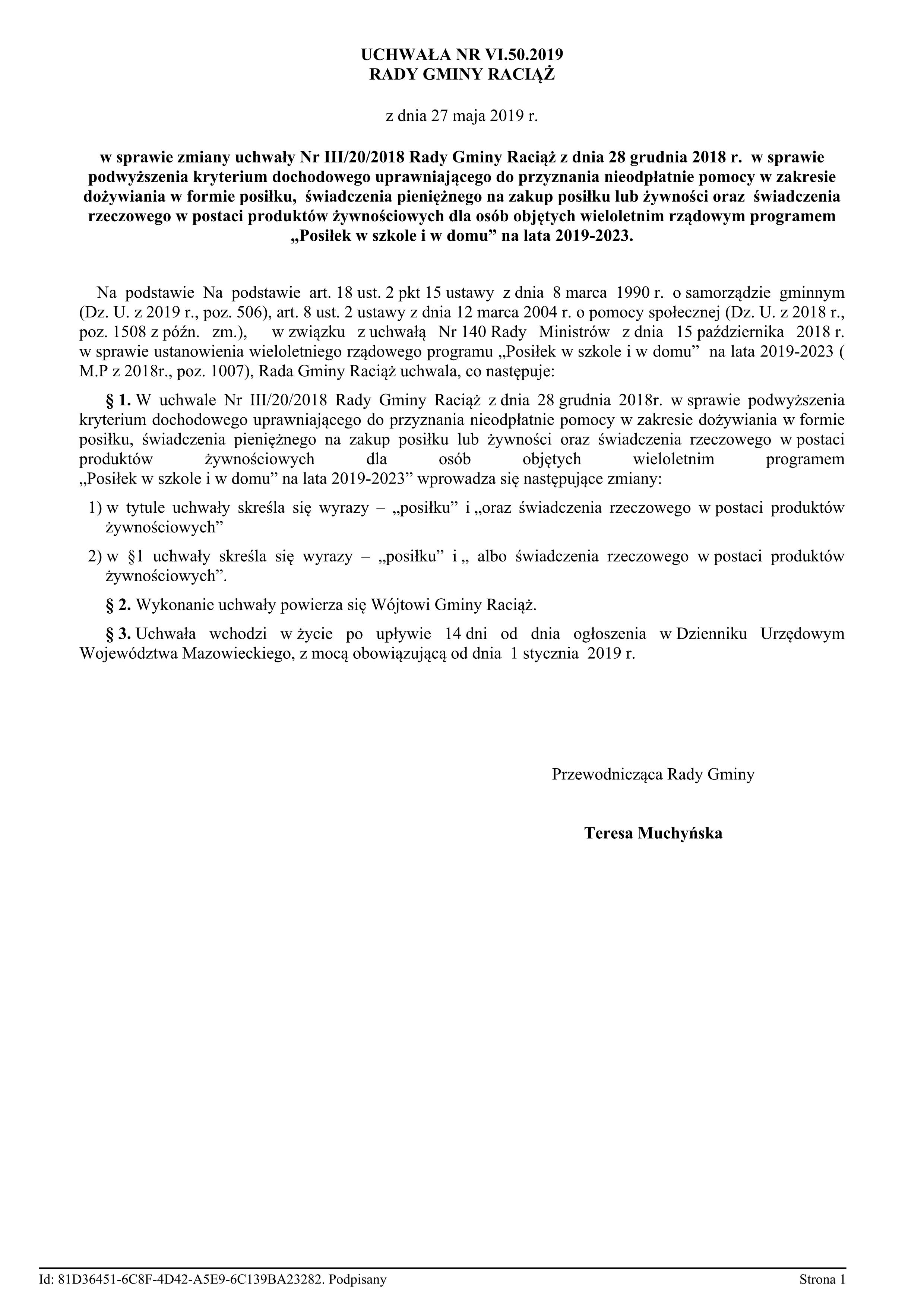 UCHWAŁA NR VI.50.2019 RADY GMINY RACIĄŻ z dnia 27 maja 2019 r.
