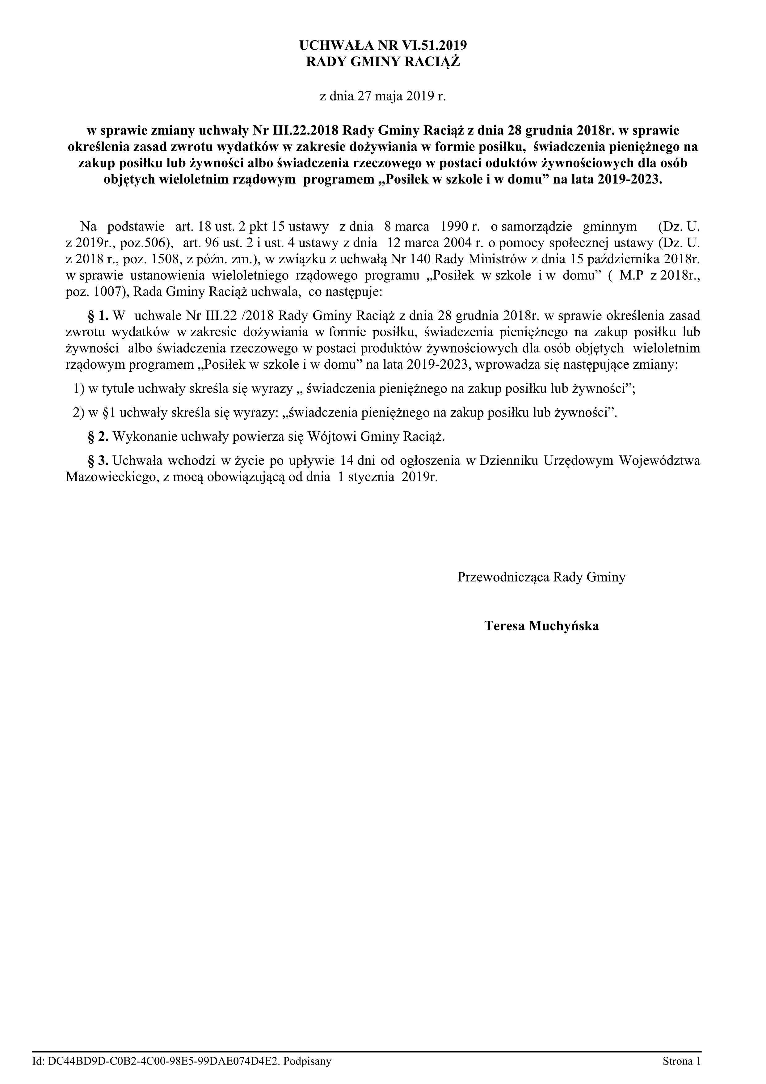 UCHWAŁA NR VI.51.2019 RADY GMINY RACIĄŻ z dnia 27 maja 2019 r.