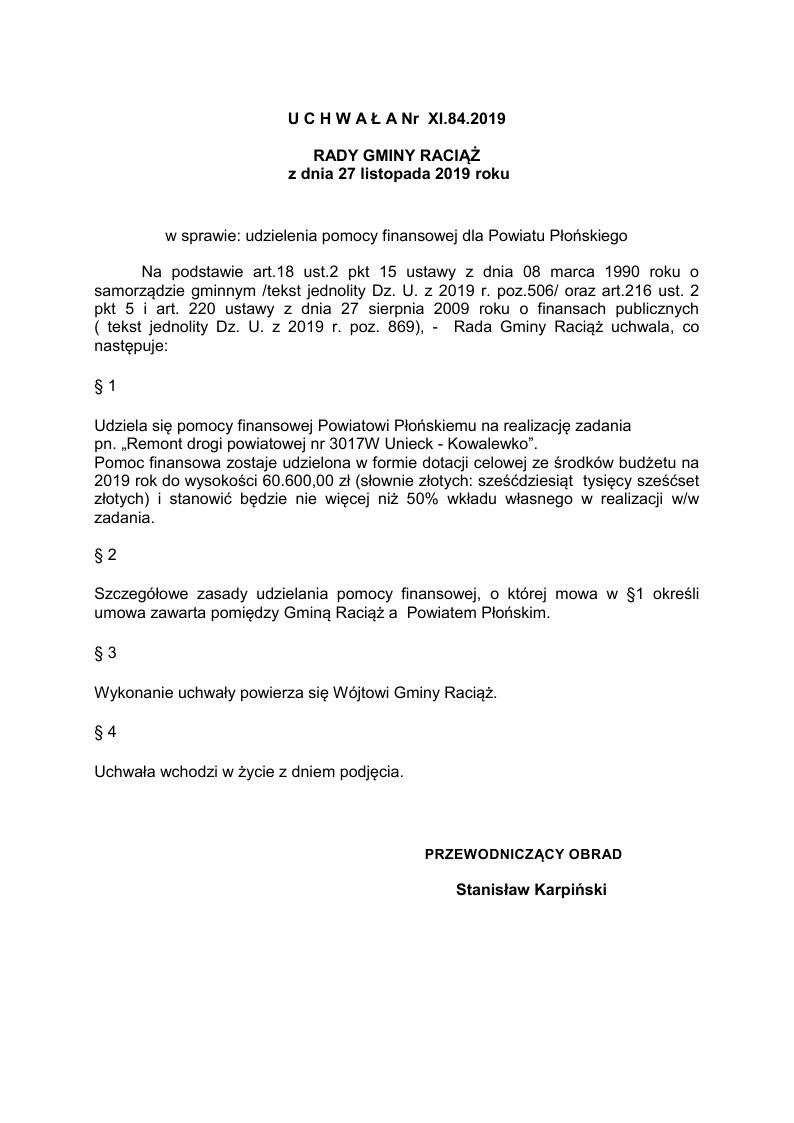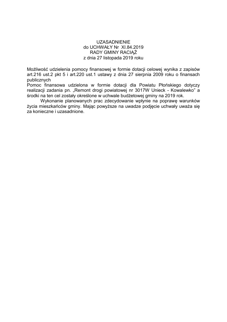 UCHWAŁA Nr XI.84.2019 RADY GMINY RACIĄŻ z dnia 27 listopada 2019r.