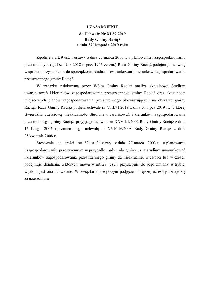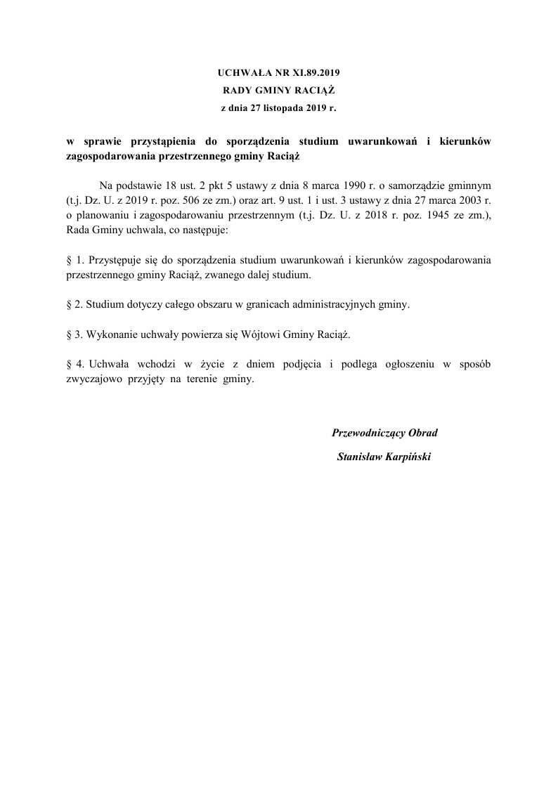 UCHWAŁA Nr XI.89.2019 RADY GMINY RACIĄŻ z dnia 27 listopada 2019r.
