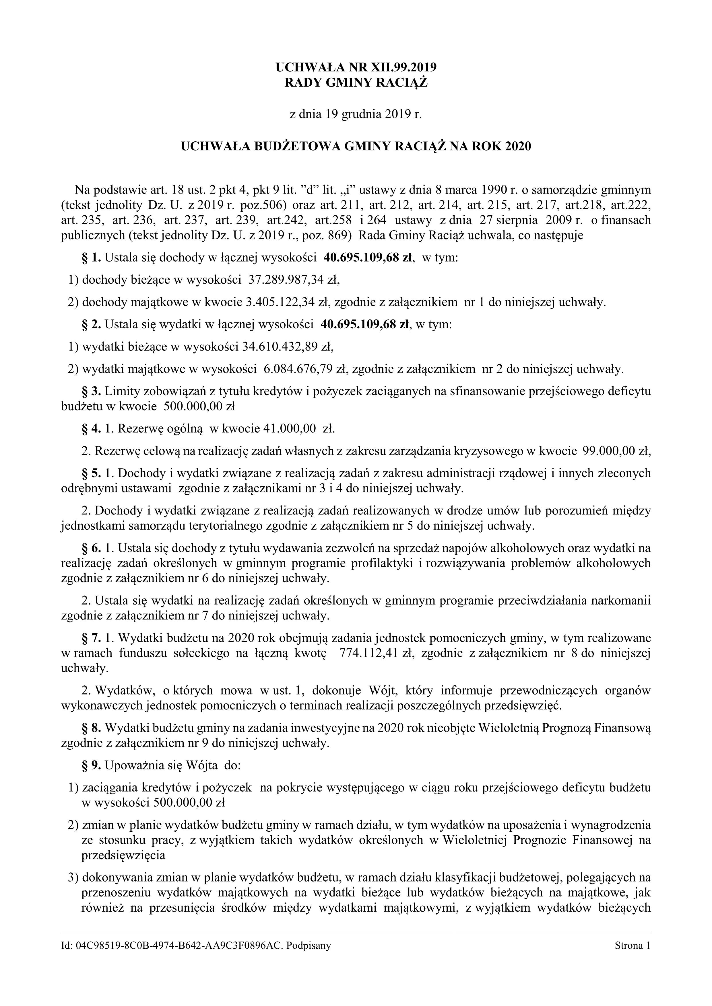 UCHWAŁA BUDŻETOWA GMINY RACIĄŻ NA ROK 2020 Z ZAŁĄCZNIKAMI I UZASADNIENIEM