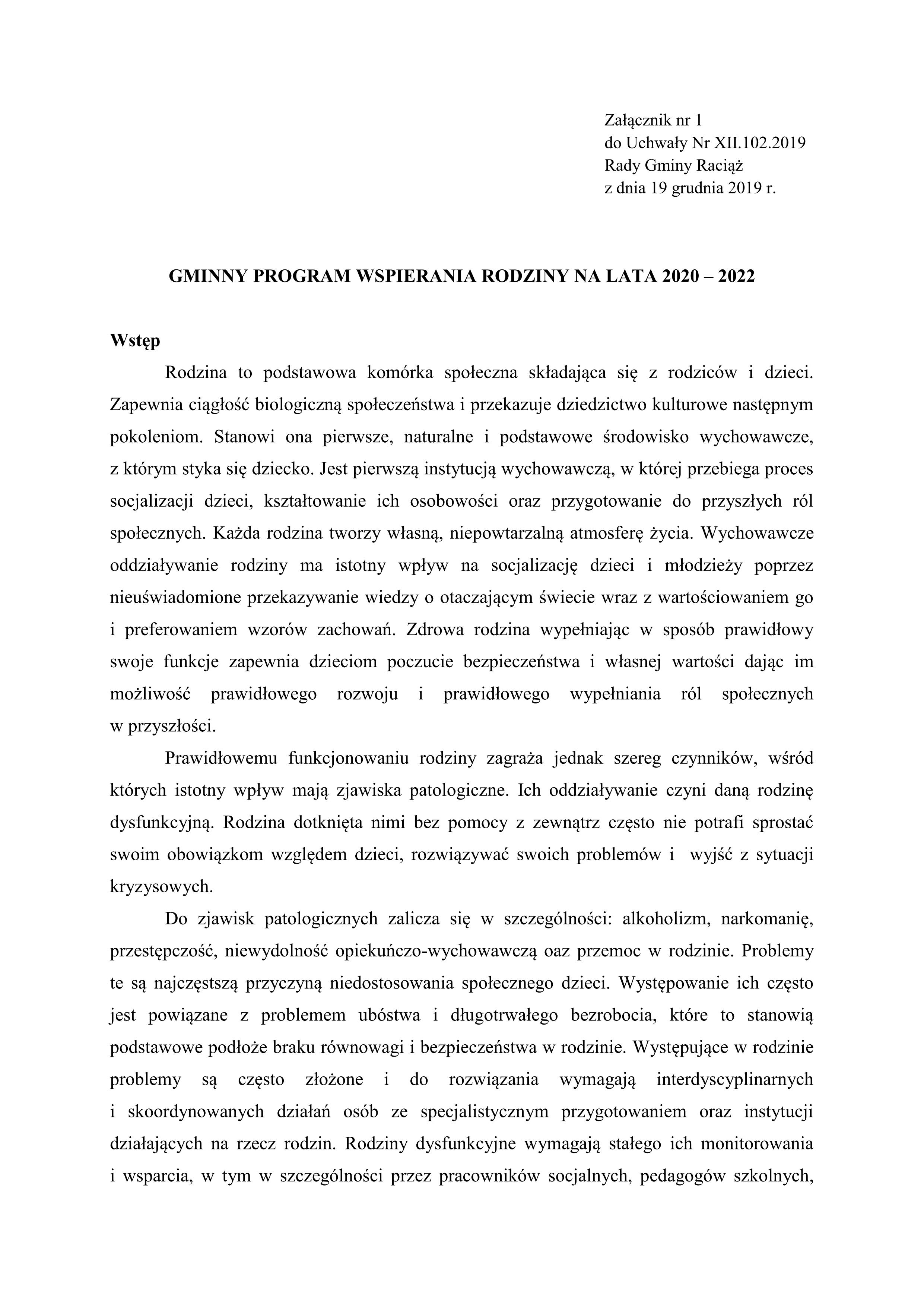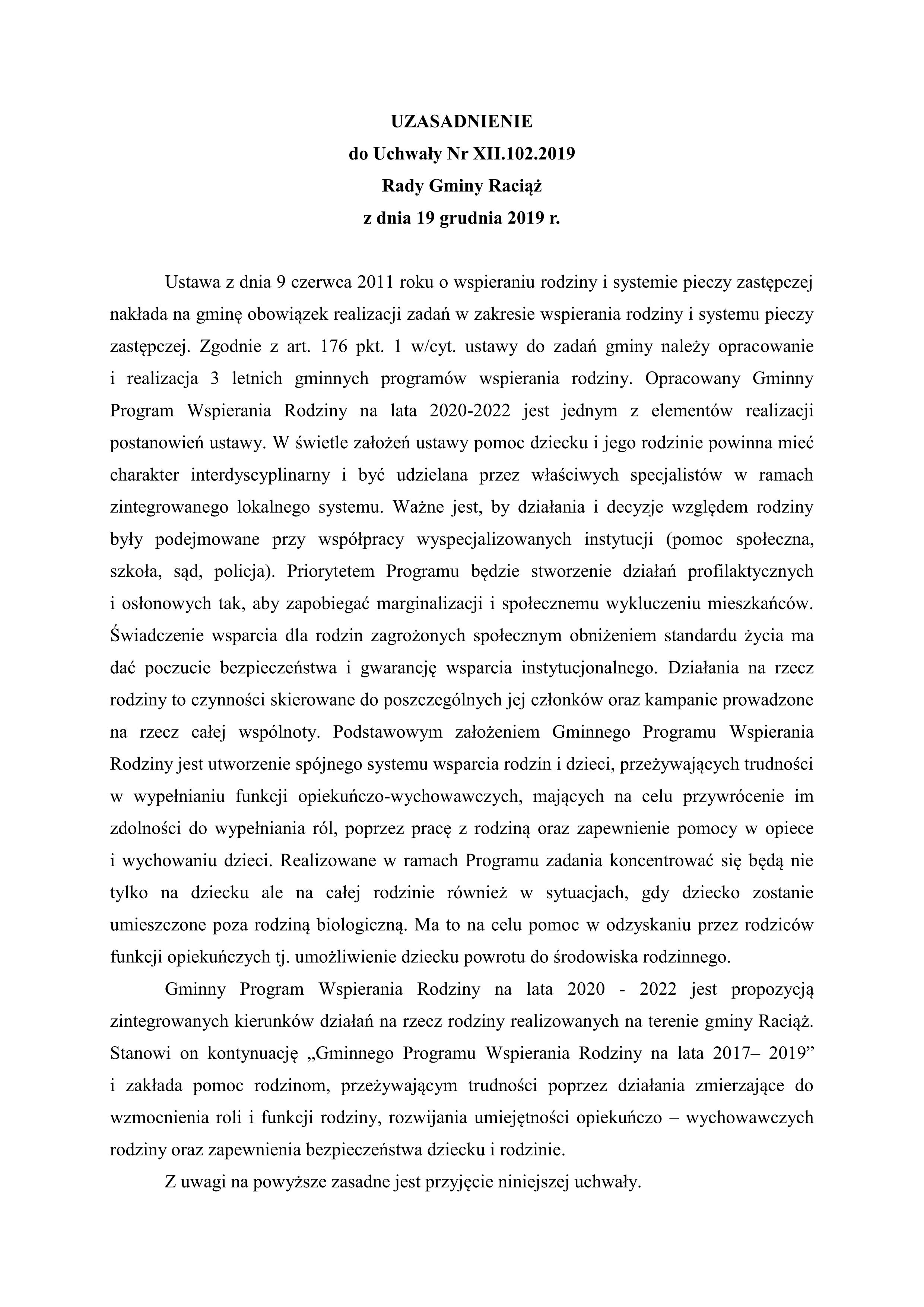 UCHWAŁA Nr XII.102.2019 RADY GMINY RACIĄŻ z dnia 19 grudnia 2019r.