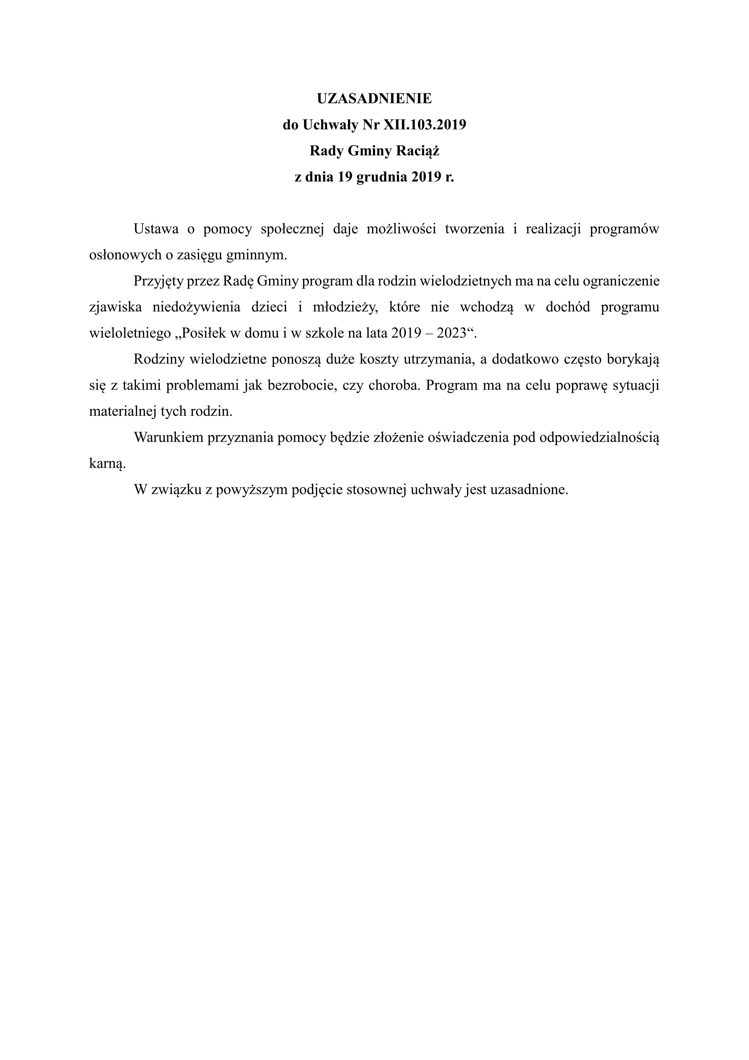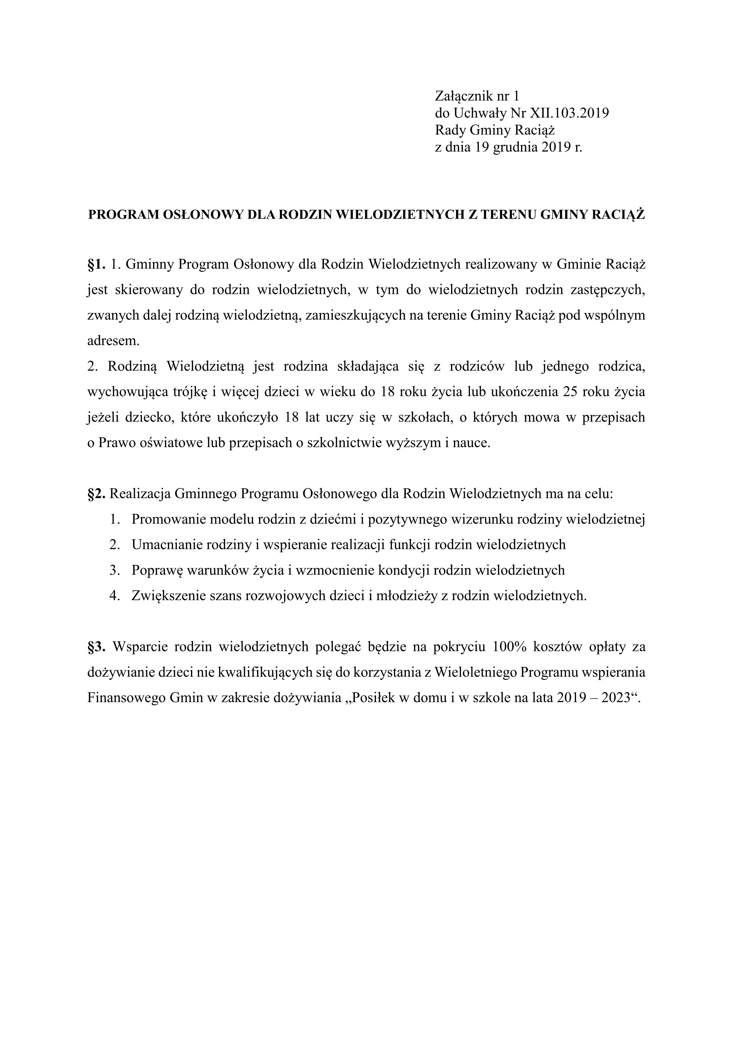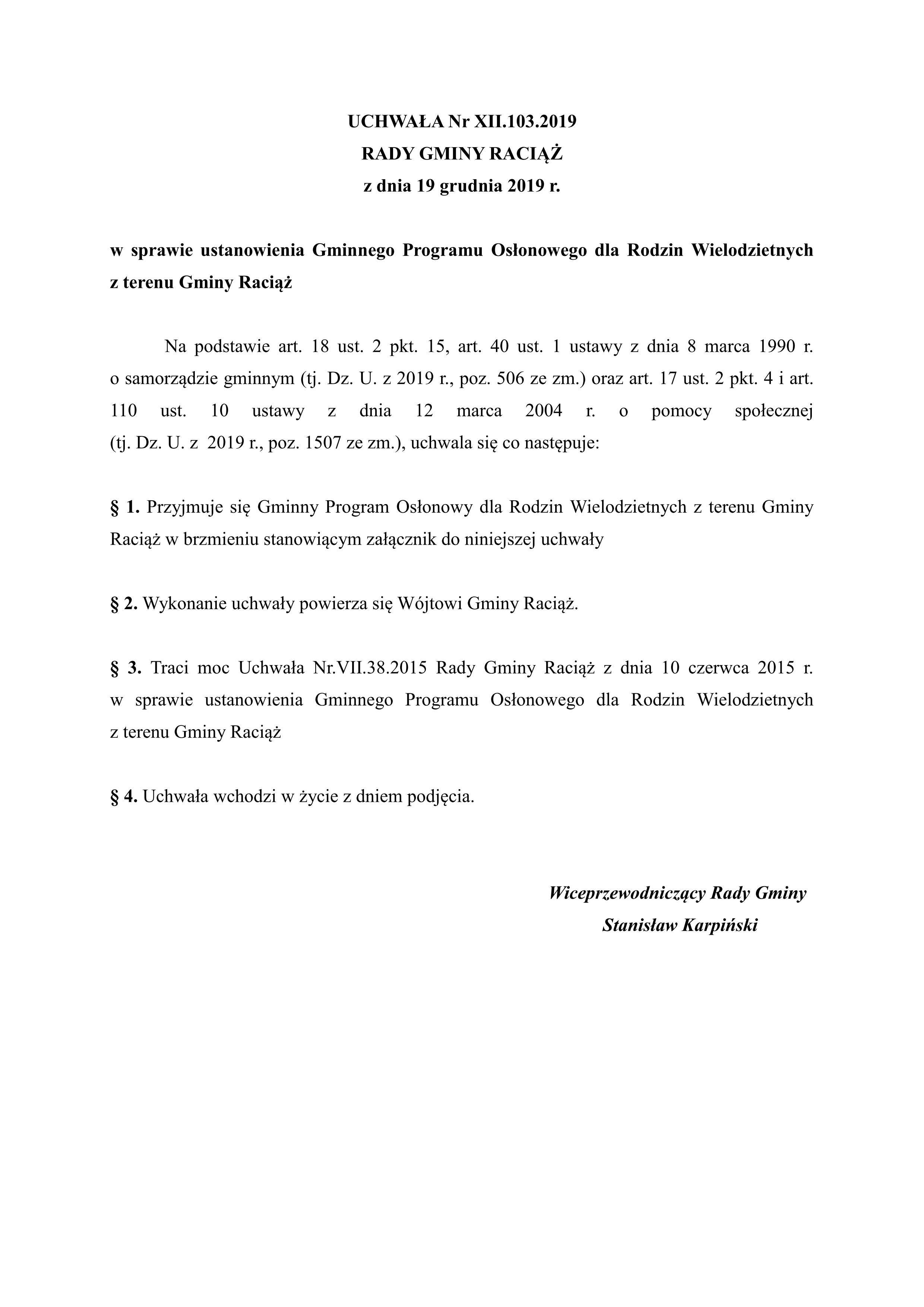 UCHWAŁA Nr XII.103.2019 RADY GMINY RACIĄŻ z dnia 19 grudnia 2019r.