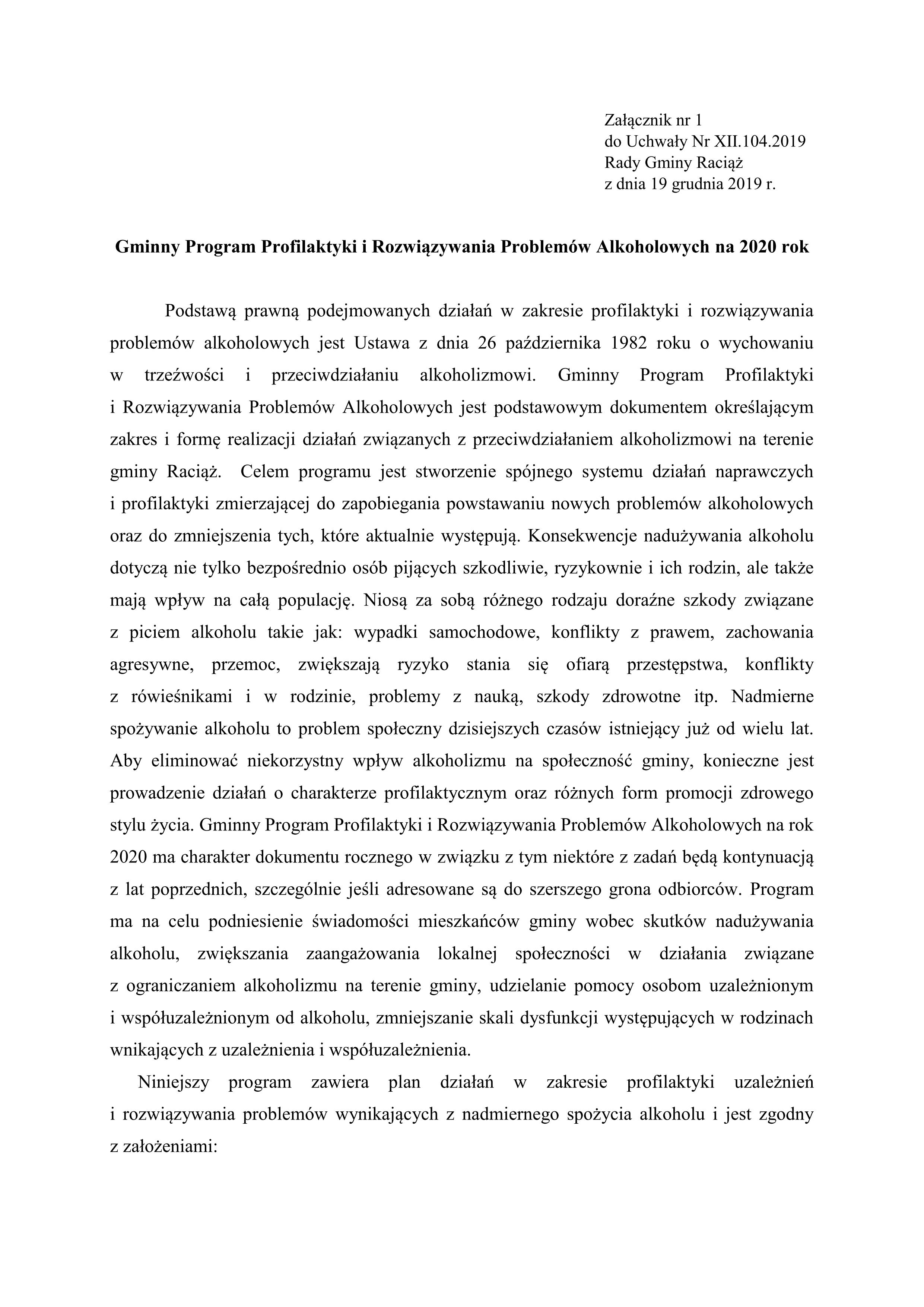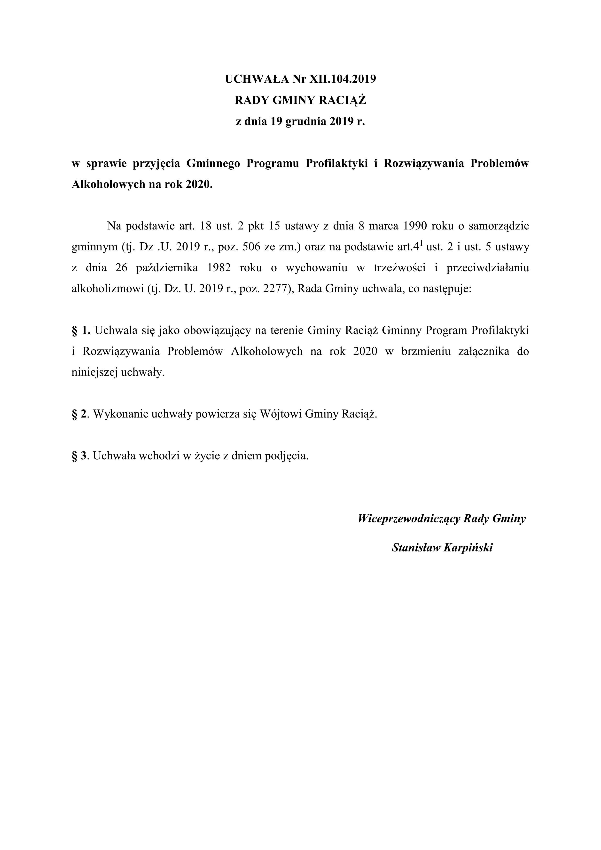 UCHWAŁA Nr XII.104.2019 RADY GMINY RACIĄŻ z dnia 19 grudnia 2019r.